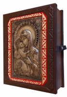 Цельнокожаный переплёт ручной работы, украшен вставкой из металлического литья в виде иконы.