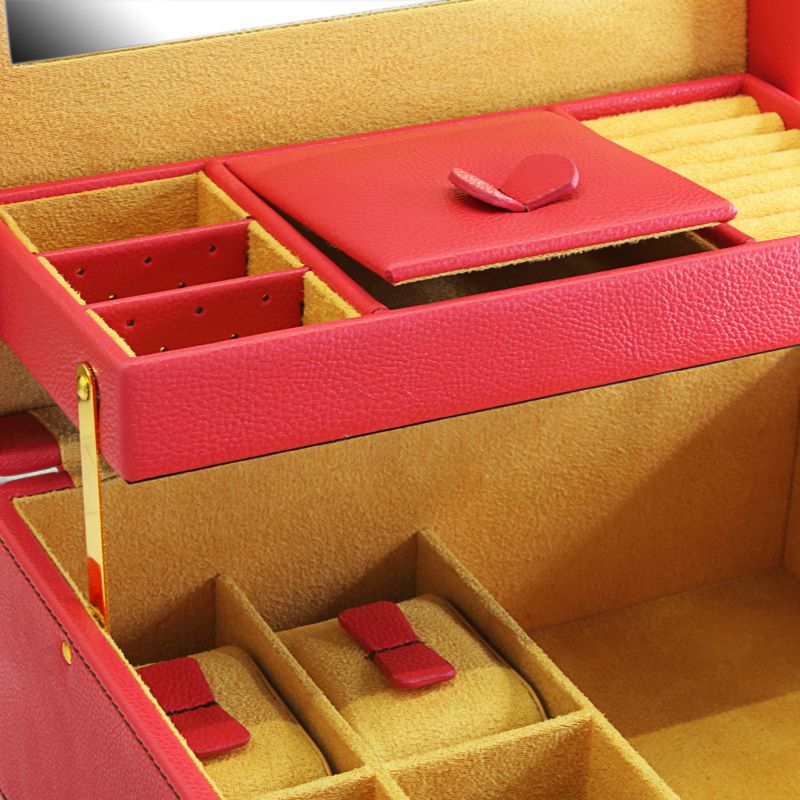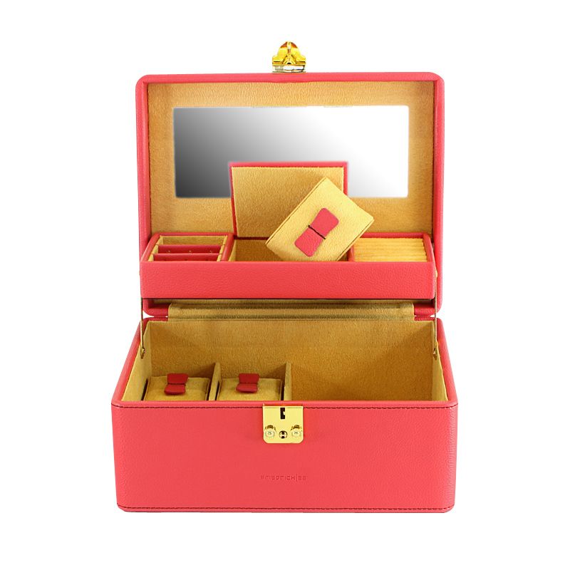 Корпус для драгоценностей оснащен 4-мя подушками для часов, большим отсеком для хранения, кольцевыми лентами, съемными отсеками для серёг, отсеком с крышкой и большим зеркалом с логотипом.