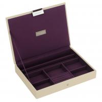 Кейс для комфортного хранения драгоценностей. Внутри – мягкая хлопковая ткань, пурпурного цвета. В шкатулке есть отделы для колец, секции для других украшений.