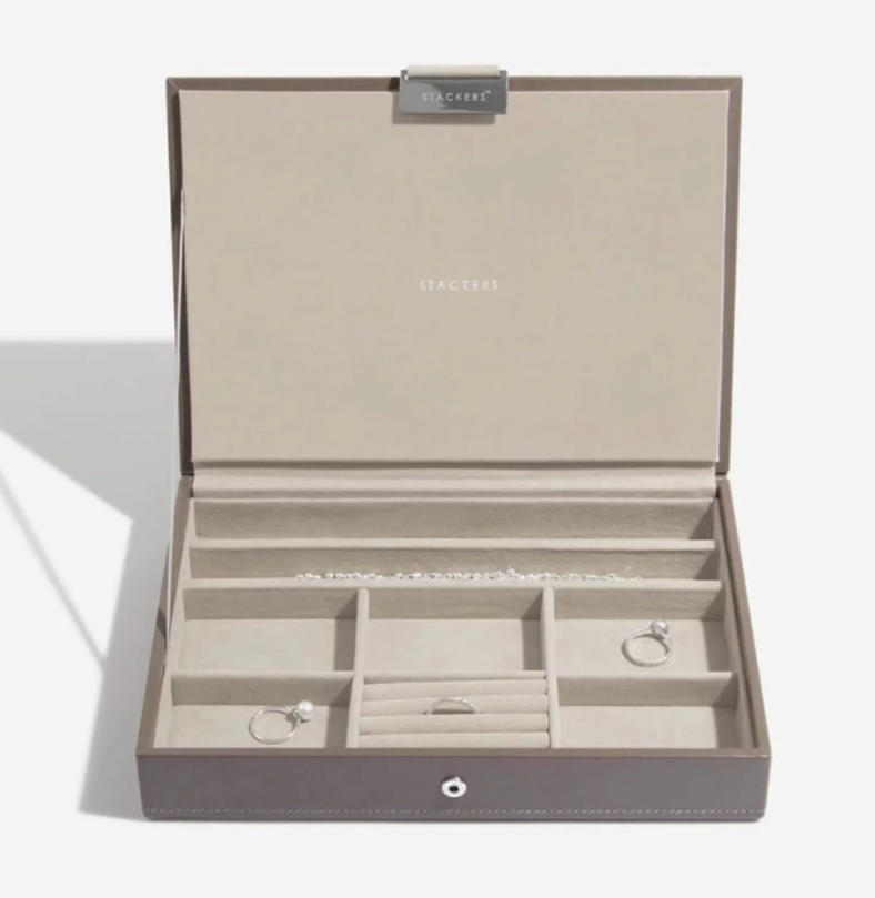 Шкатулка из коллекции Stackers среднего размера ("М"-25x18 см.) для хранения украшений выполнена из качественной экокожи цвета тауп.