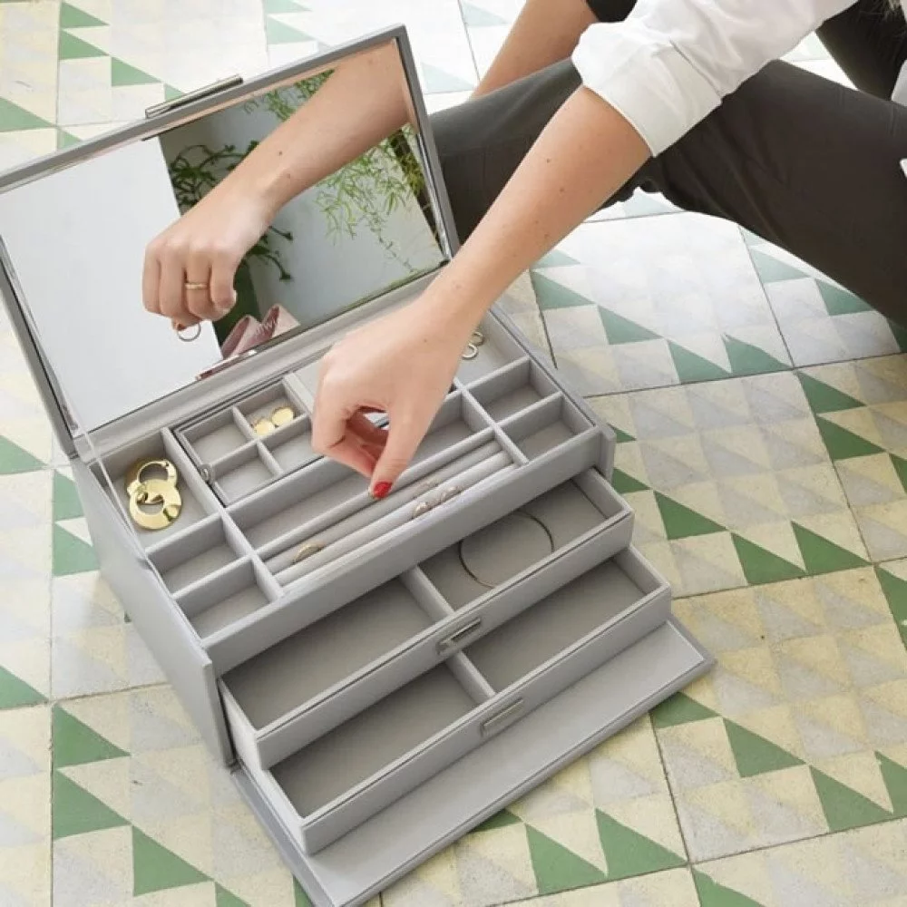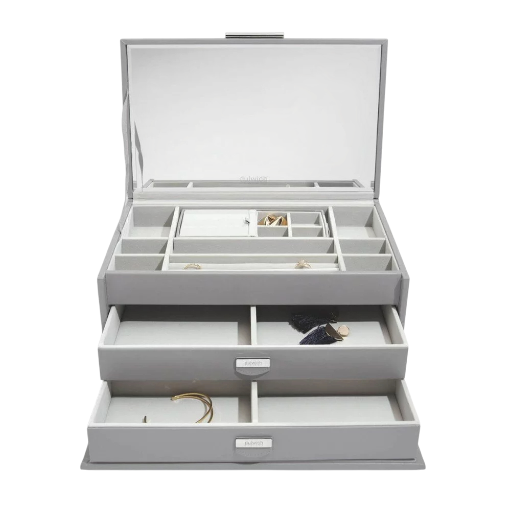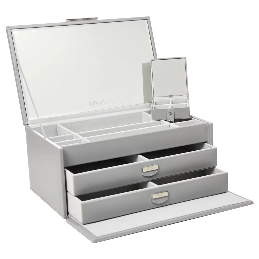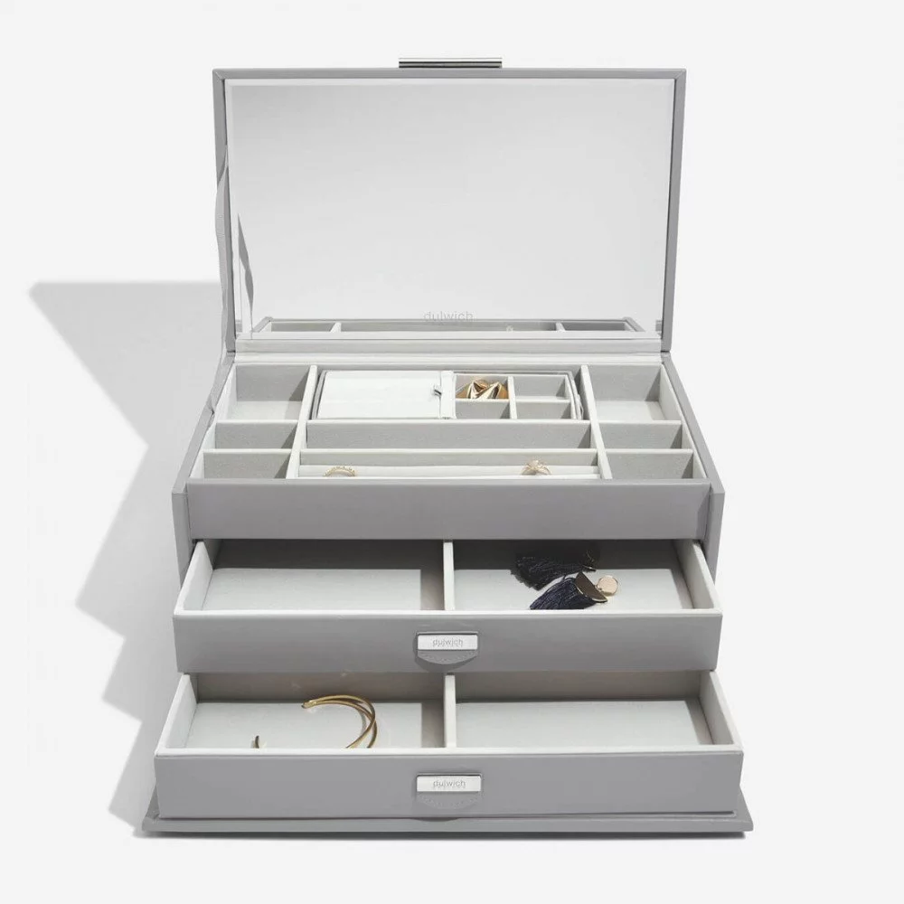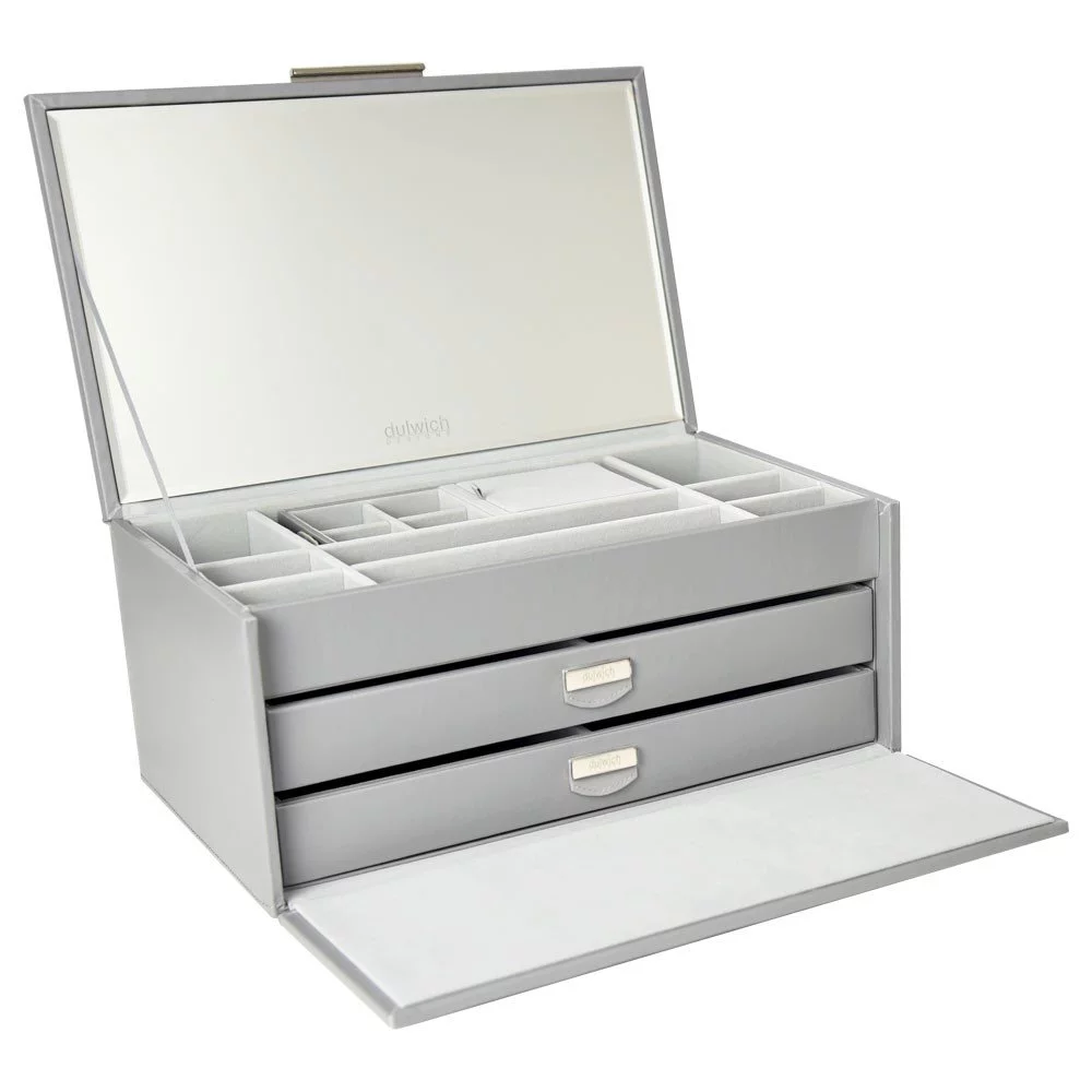Большая многофункциональная шкатулка из премиальной коллекции Dulwich для хранения украшений с внешней отделкой из натуральной кожи серого цвета.