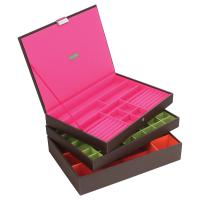 Большая трехуровневая шкатулка, которая комфортно сохранит Ваши драгоценности в полной безопасности. Первый ярус состоит из небольших лотков для украшений и запонок, отделения для цепочек и браслетов. На верхнем ярусе имеется также валик для сережек и колец. Второй ярус состоит из небольших отсеков для мелких украшений, и средних драгоценностей. Нижний ярус имеет 11 отсеков разной величины. Шкатулка выполнена из высококачественных материалов, как снаружи так и внутри.
