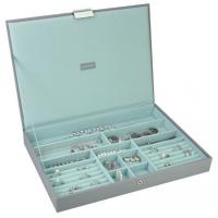Одноуровневая шкатулка для хранения драгоценностей, красивого серого цвета из экокожи. Большие валики для сережек и колец, пять лотков для украшений и большое отделение для цепочек - все это расположено в шкатулке. Закрывается на клипсу.