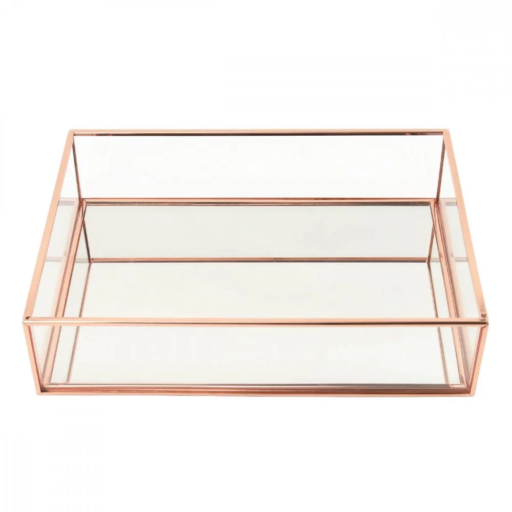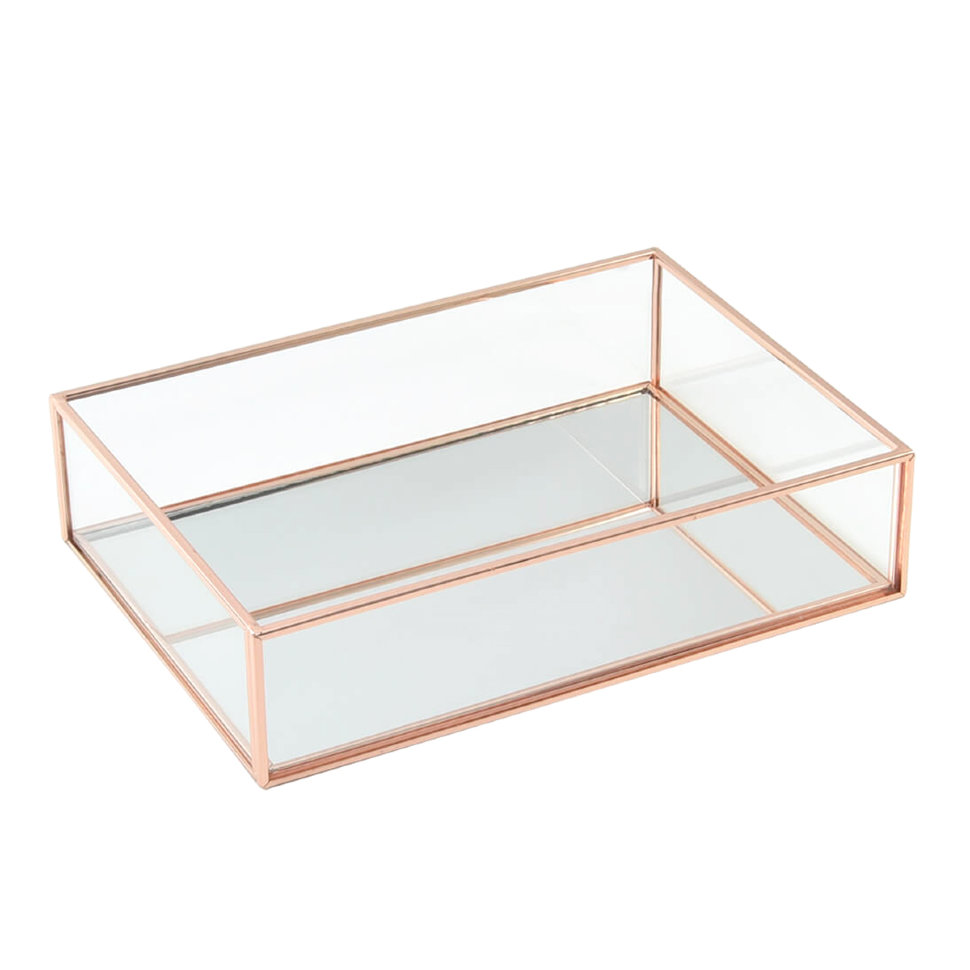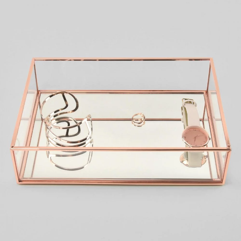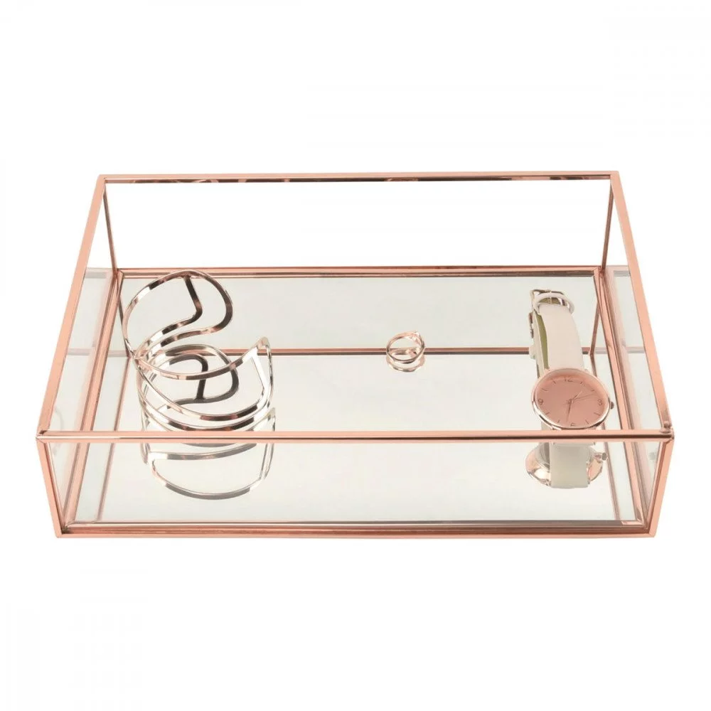 Бокс выполнен из металла цвета "розовое золото" и стекла, с зеркальным основанием.