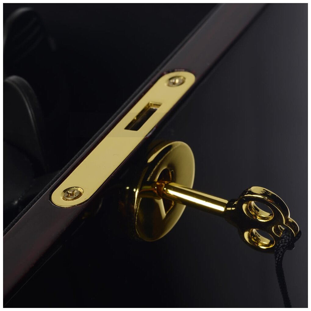Шкатулка выполнена из МДФ, отделанным шпоном из натурально дерева и покрытым рояльным лаком.