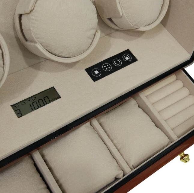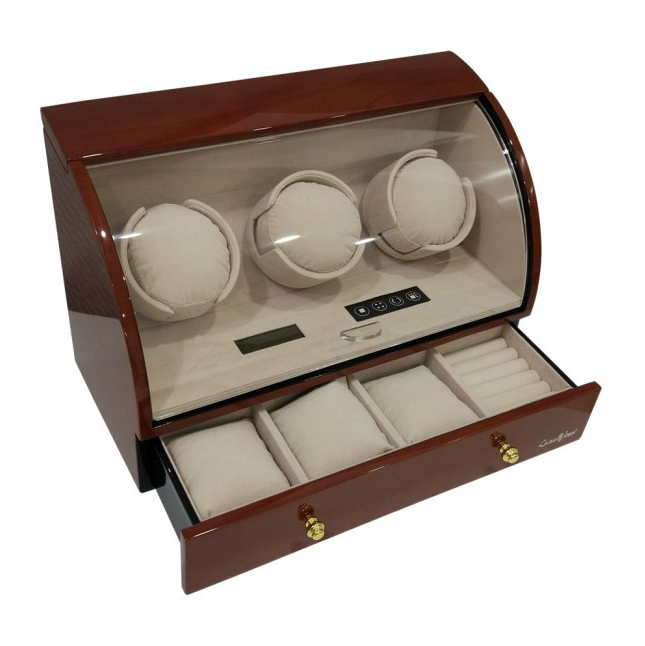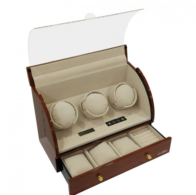 В нижней части имеется выдвижной ящик для хранения ювелирных изделий и дополнительного набора часов.
