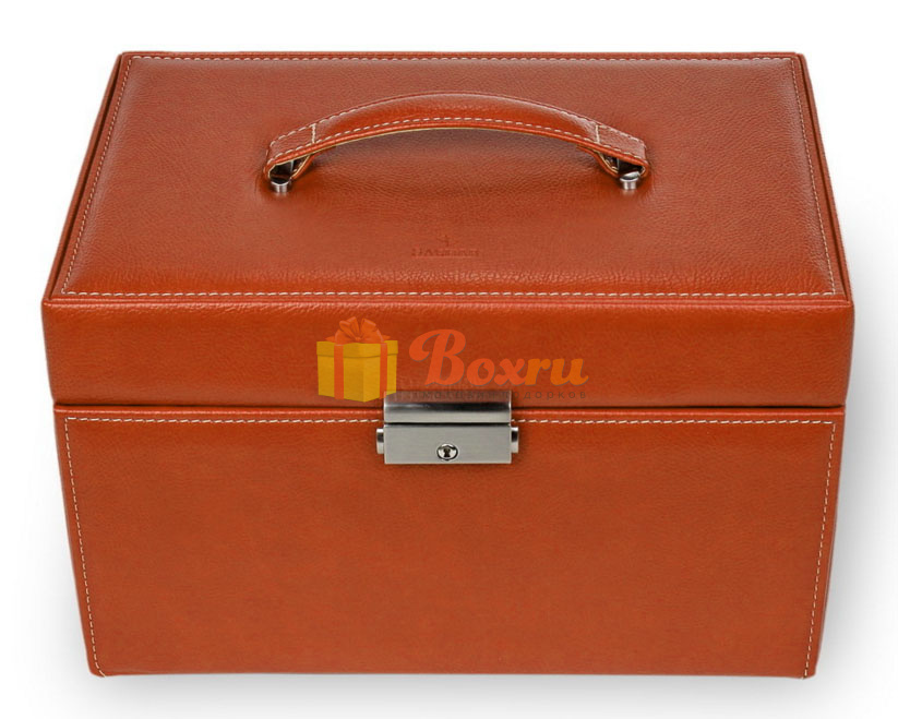 Шикарная шкатулка для хранения украшений с тремя выдвижными ящичками и сепаратным вертикальным ящичком с крючками для цепочек и маленьким боксом для поездок.