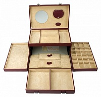 Верхний ярус: Большое отделение с валиками для колец и запонок / Две отделения с подушечками для цепочек.