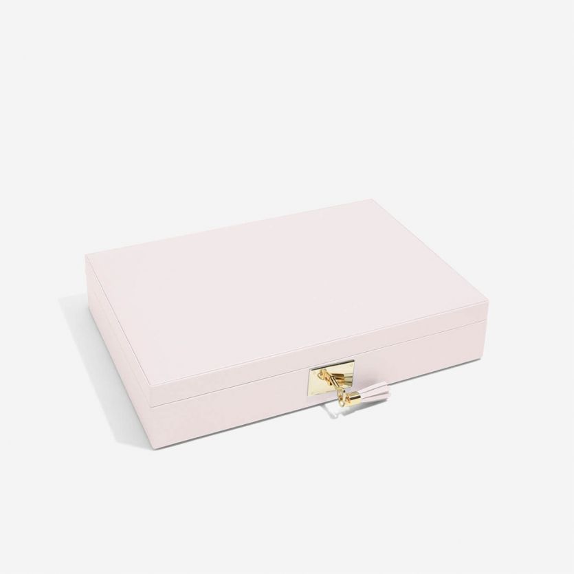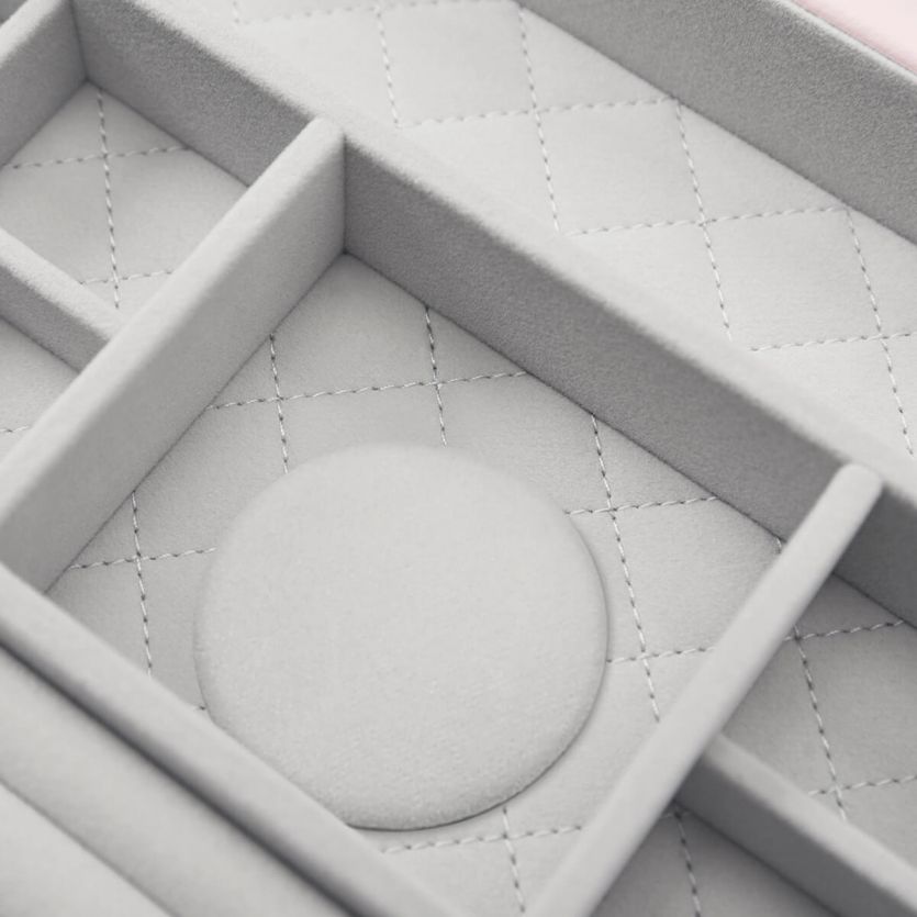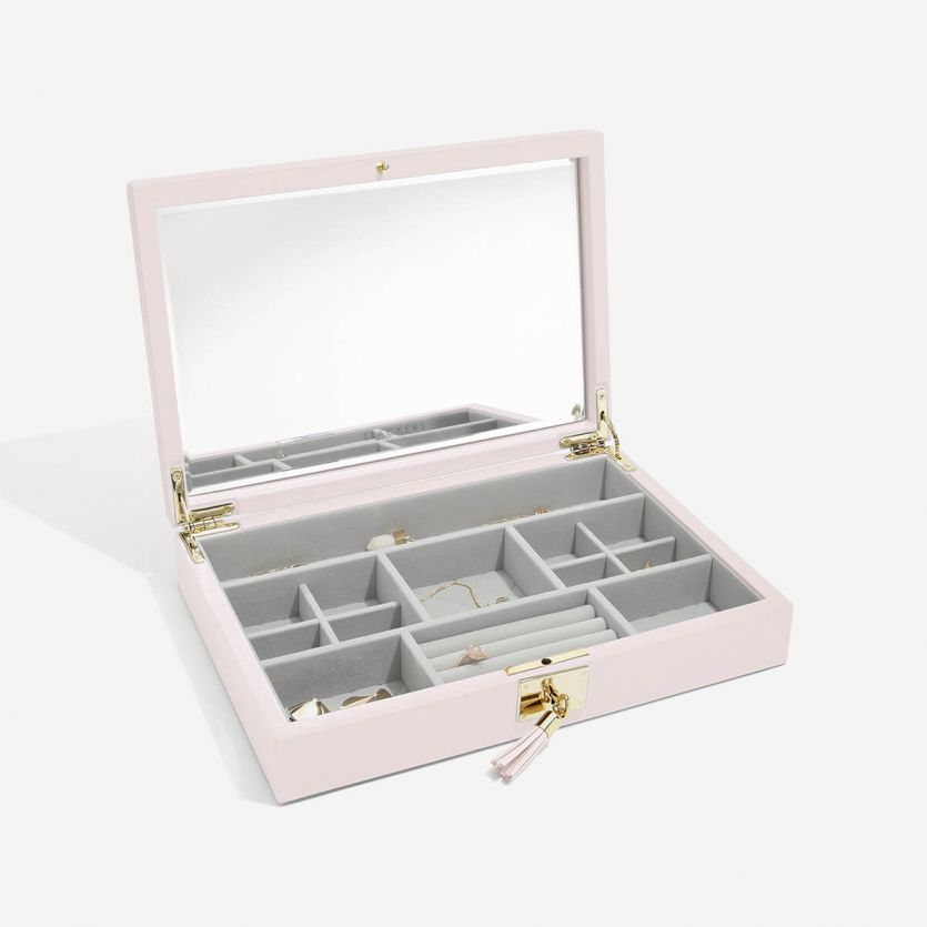 Шкатулка для драгоценностей из натуральной кожи нежно-розового цвета способна вместить большое количество украшений за счет продуманной и эргономичной конструкции.