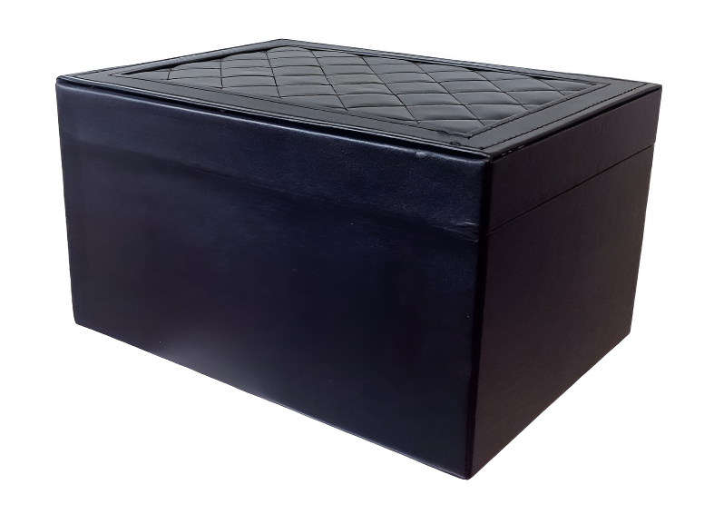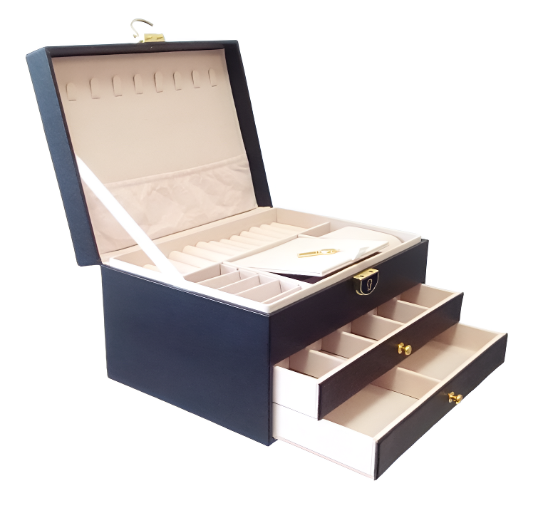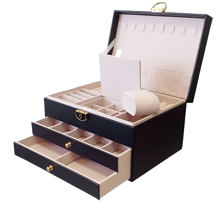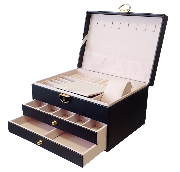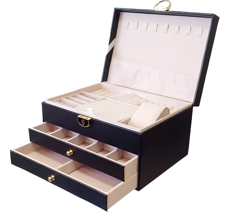Вместительная трехъярусная шкатулка для хранения украшений из искусственной кожи черного цвета.