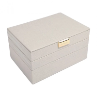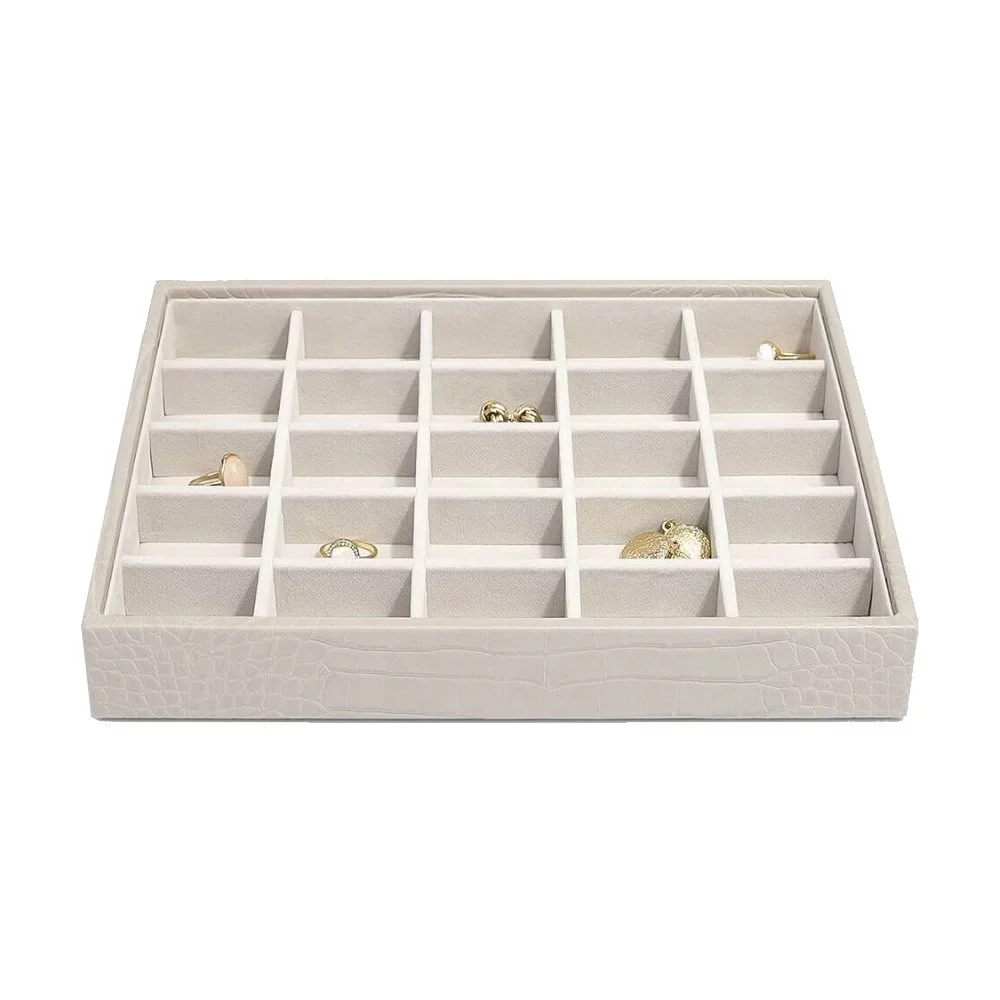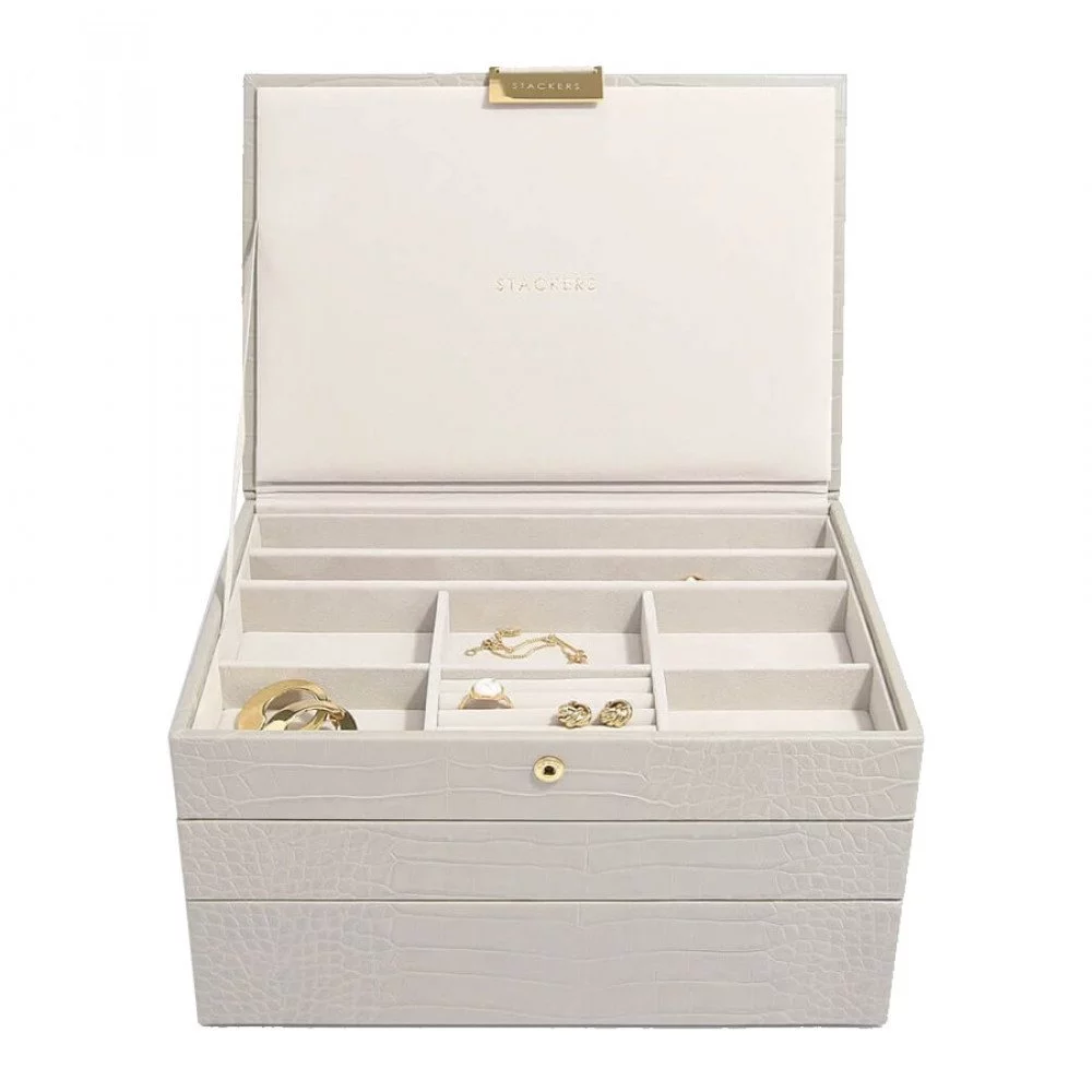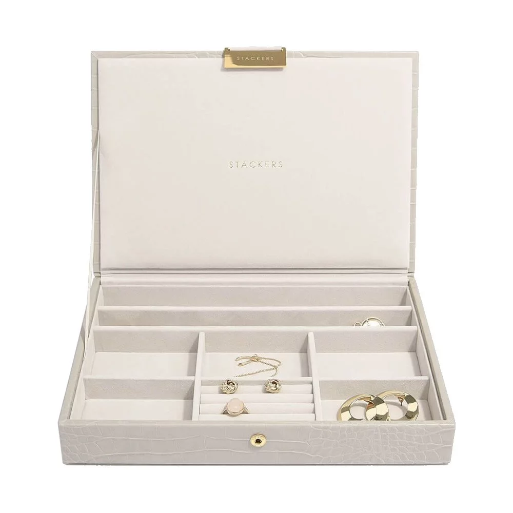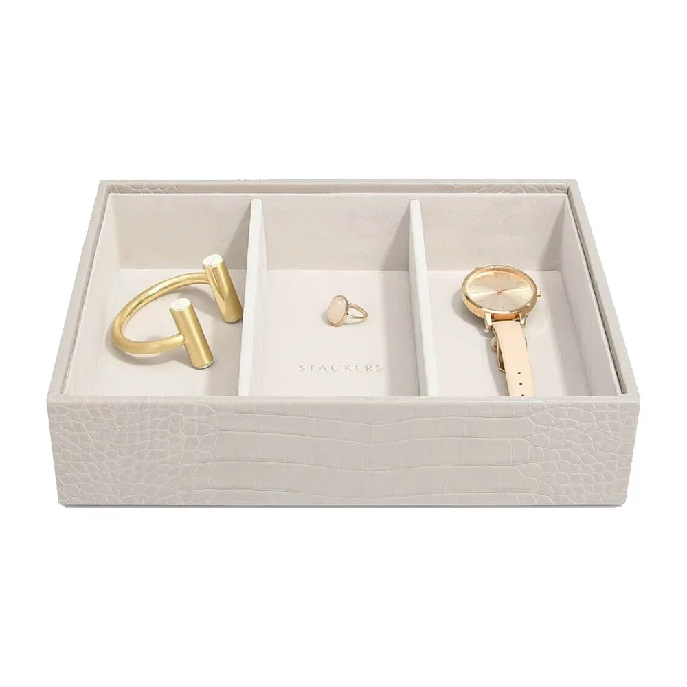 Трехуровневая шкатулка для драгоценностей из новой коллекции Stackers PUTTY CROC CLASSIC от английской марки LC Designs выполнена из высококачественной экокожи цвета светлый тауп (серо-коричневый) с фактурной отделкой под "крокодила". Внутренняя отделка из вельвета светло-серого цвета.