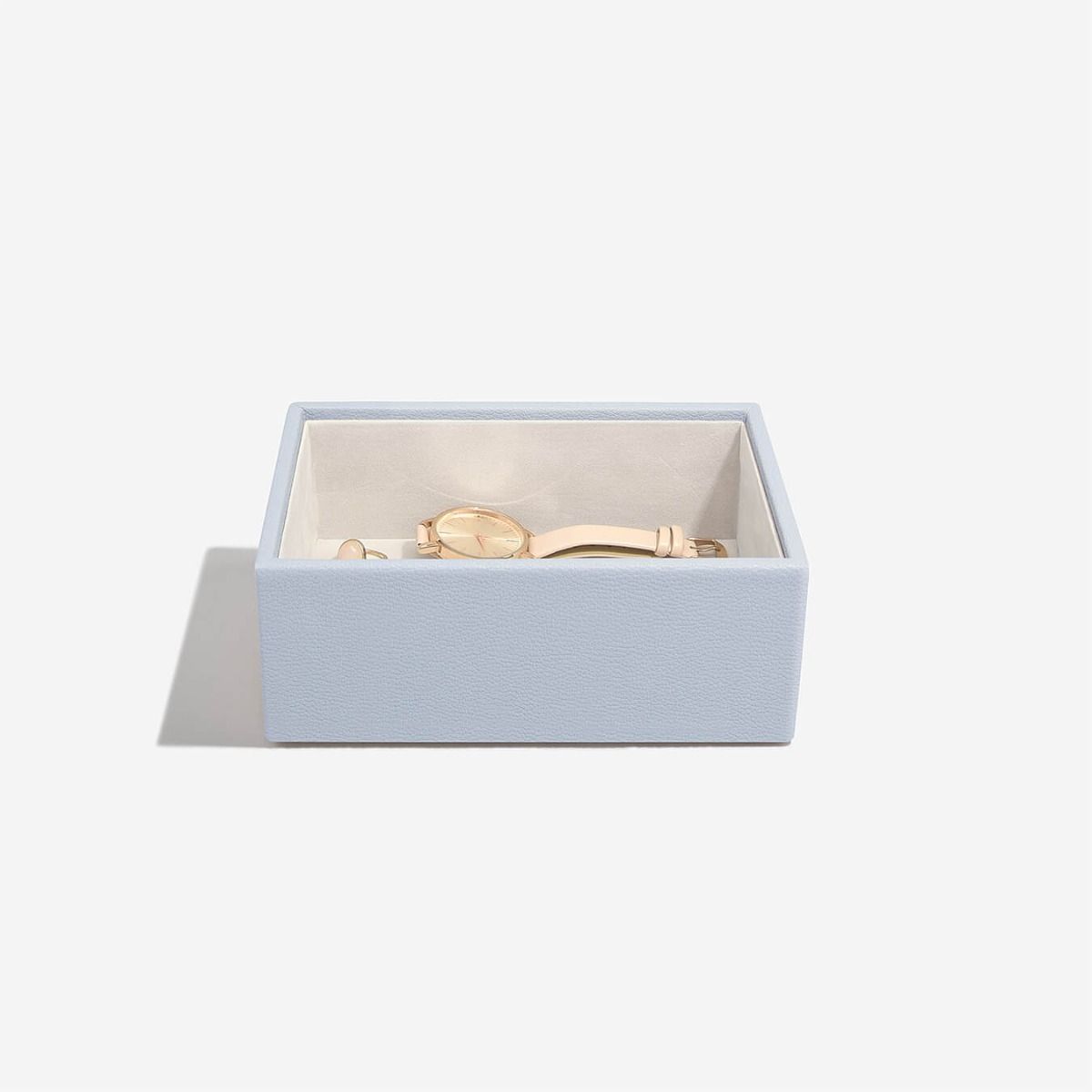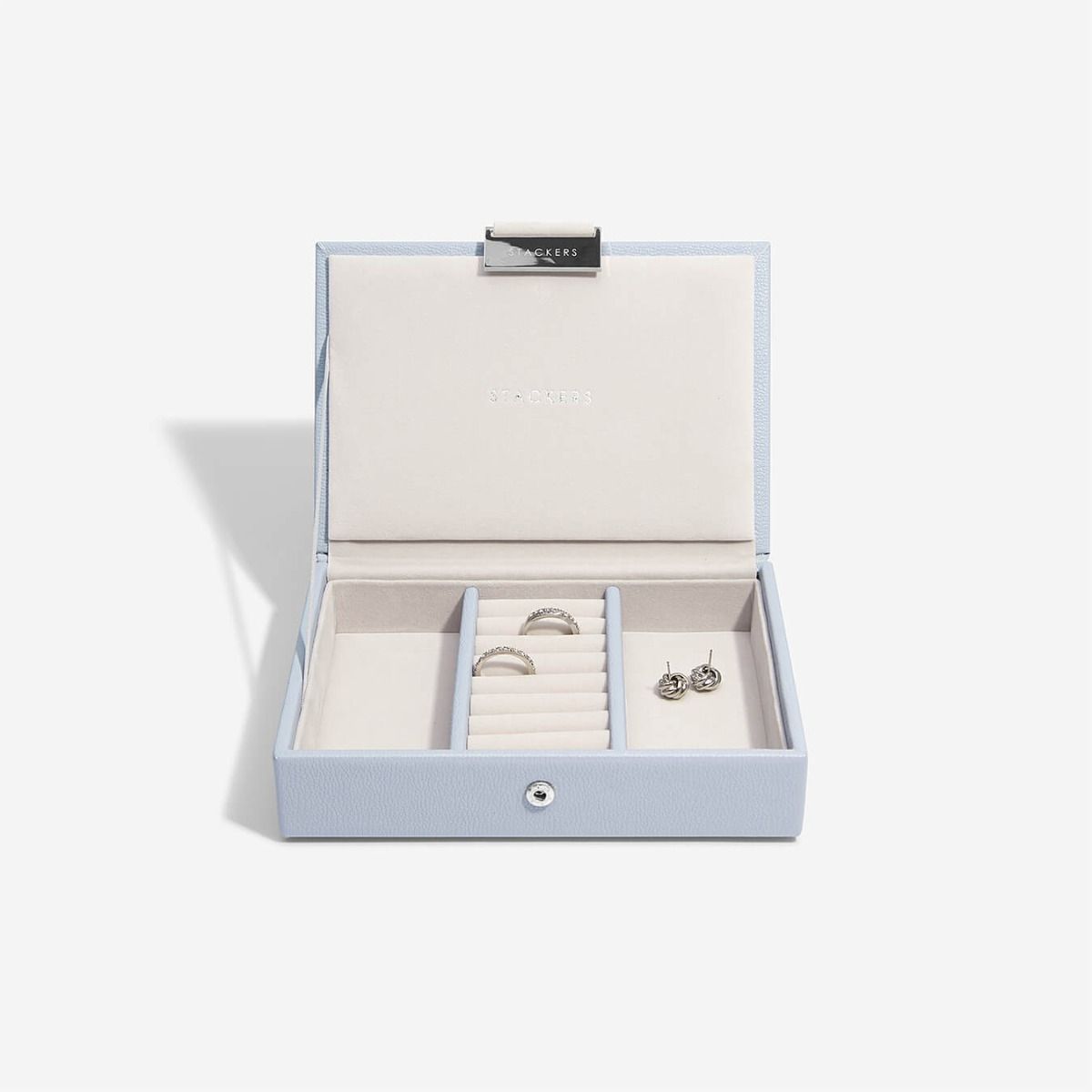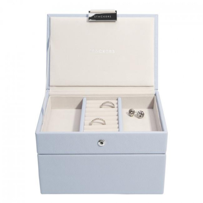 Маленькая ("S"-18x12,5 см) шкатулка из коллекции Stackers для хранения украшений выполнена из качественной экокожи голубого цвета с тиснением, и имеет два яруса не закрепленные между собой.