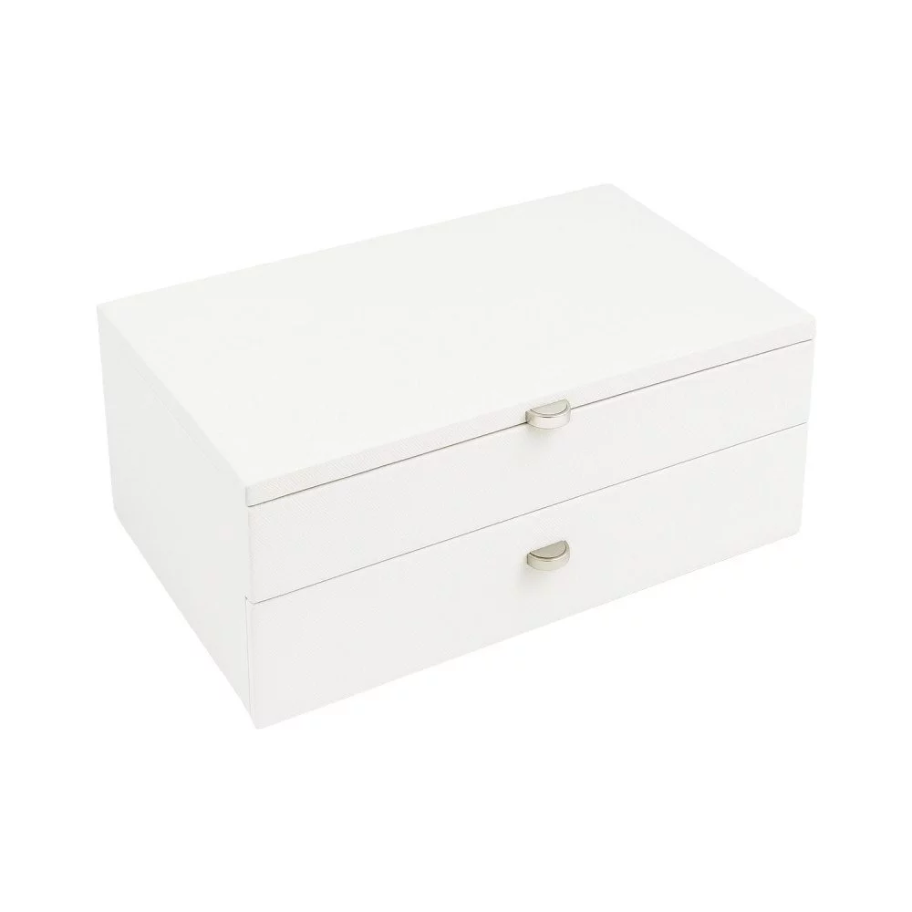 Верхняя полка оснащена пятью отсеками и валиком для колец и серёг, а нижний выдвижной ярус предлагает универсальные отделения для разных аксессуаров.
