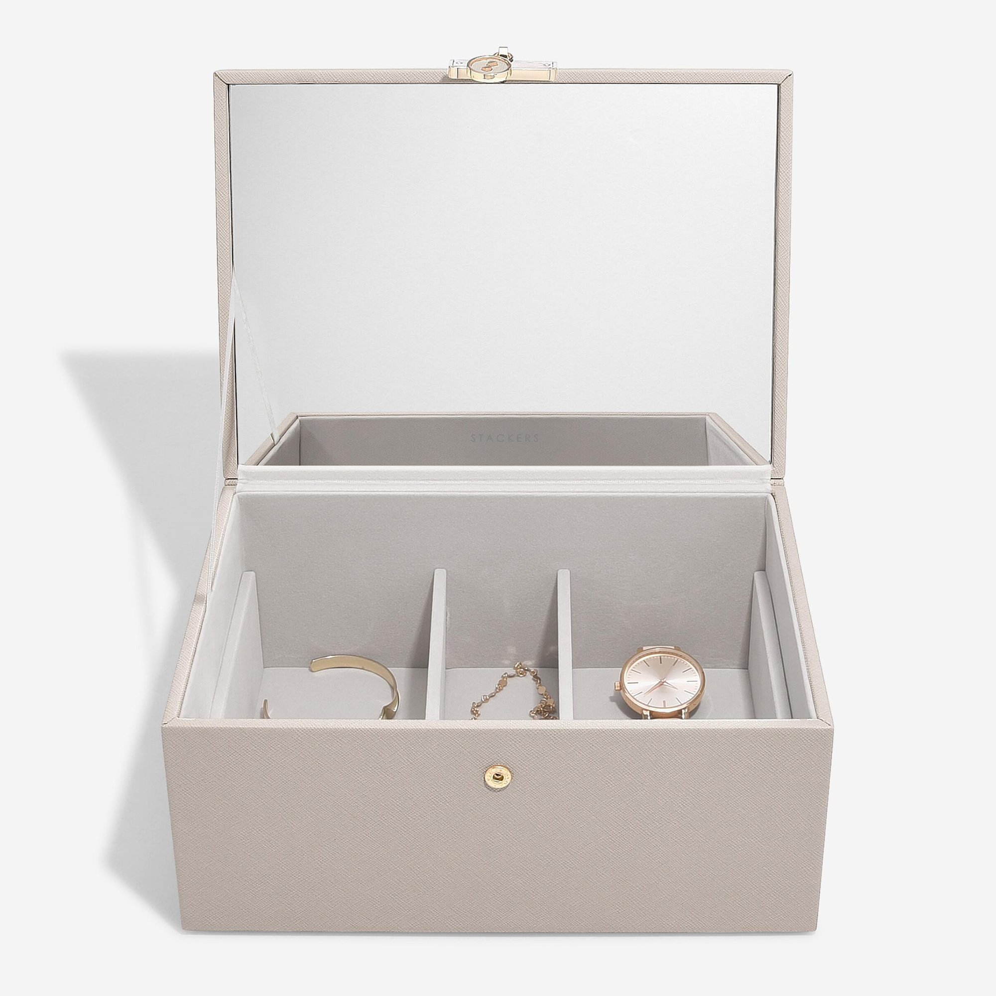 Просторное нижнее отделение с тремя секциями идеально для крупных украшений или аксессуаров.