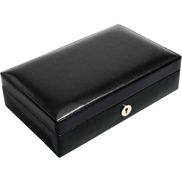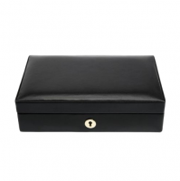 Шкатулка выполнена из натуральной испанской черной кожи с богатой отделкой интерьера из вельвета бежевого цвета.