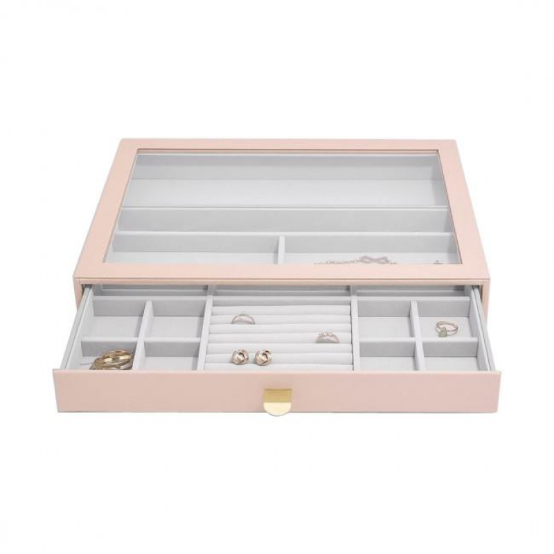 Большая ("XL"-36x25 см.) шкатулка с выдвижным ящиком для хранения украшений Stackers от английской марки LC Designs выполнена из высококачественной экокожи розового цвета с фактурой "перо голубя".