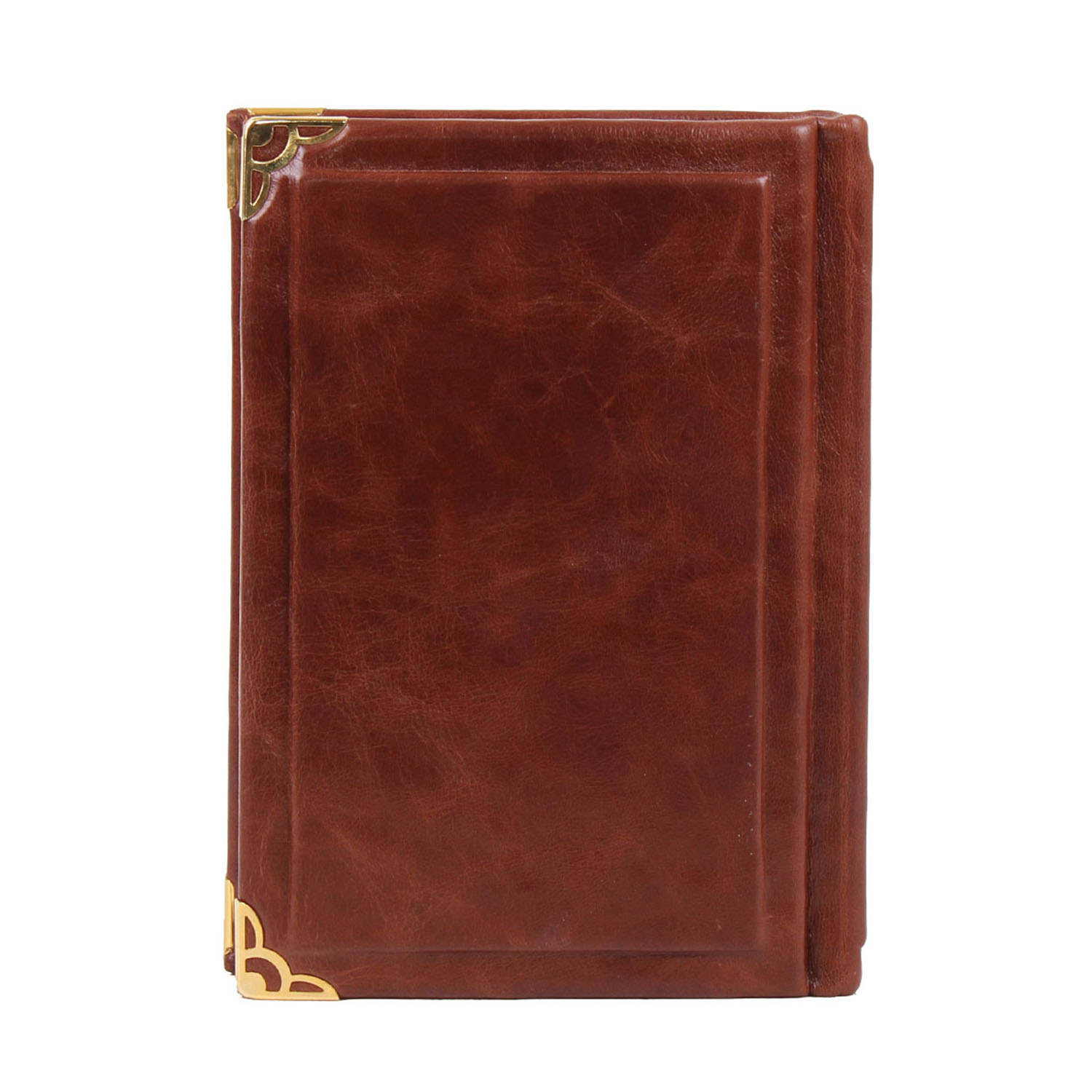 Цельнокожаный переплёт ручной работы, украшен иллюстрированной вставкой из цветного металла.
