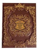 Цельнокожаный переплёт ручной работы, украшен вставкой из цветного металла с золотой печатью.