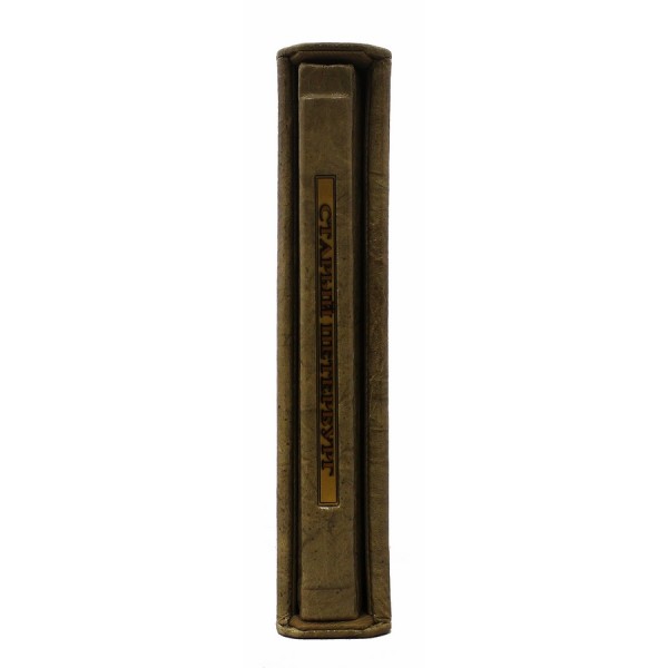 Цельнокожаный переплёт ручной работы, украшен иллюстрированной вставкой из цветного металла.