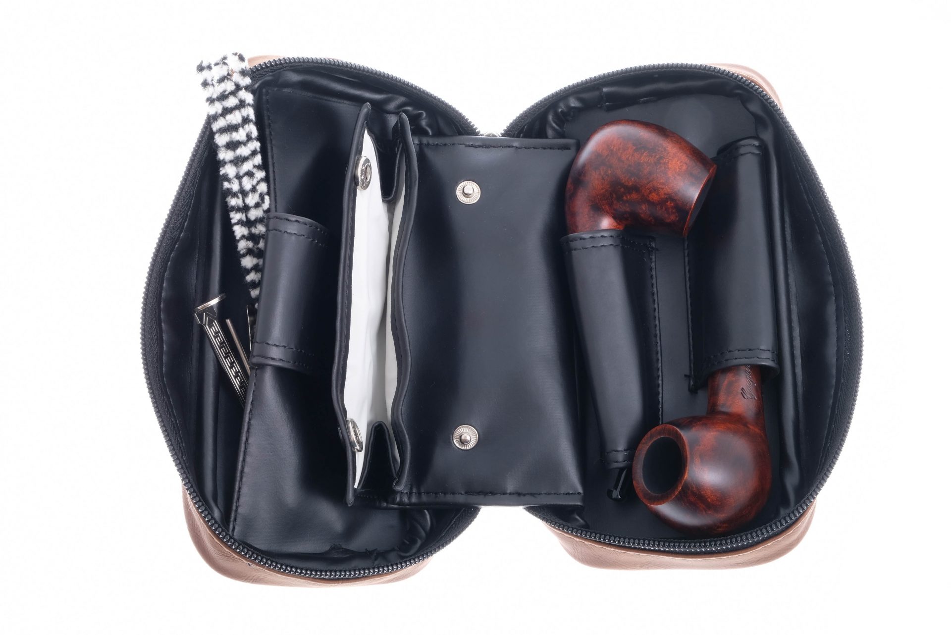 Вместительная сумка для двух трубок, табака и аксессуаров. Внутри есть съемный кисет для табака с резиновой вставкой для сохранения влажности. Эта серия недорогих, но качественных курительных аксессуаров производится по заказу и под контролем итальянской компании Parenti&Agostinelli из Милана.