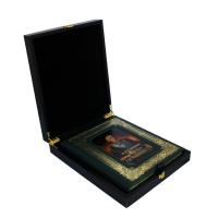 Дизайн прекрасно сочетает в себе золотое и бинтовое тиснение, художественную металлическую вставку, соответствующую тематике издания, а также крашенный в тон переплетного материала обрез.