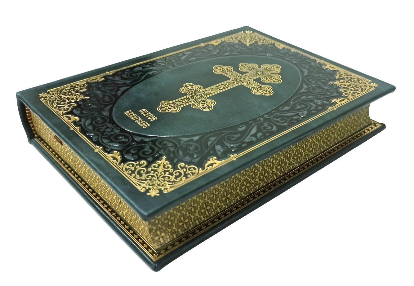 Использован твердый переплет с тиснением золотой фольгой, качественная офсетная бумага.