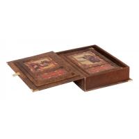 Цельнокожаный переплёт ручной работы, украшен иллюстрированной вставкой из цветного металла.