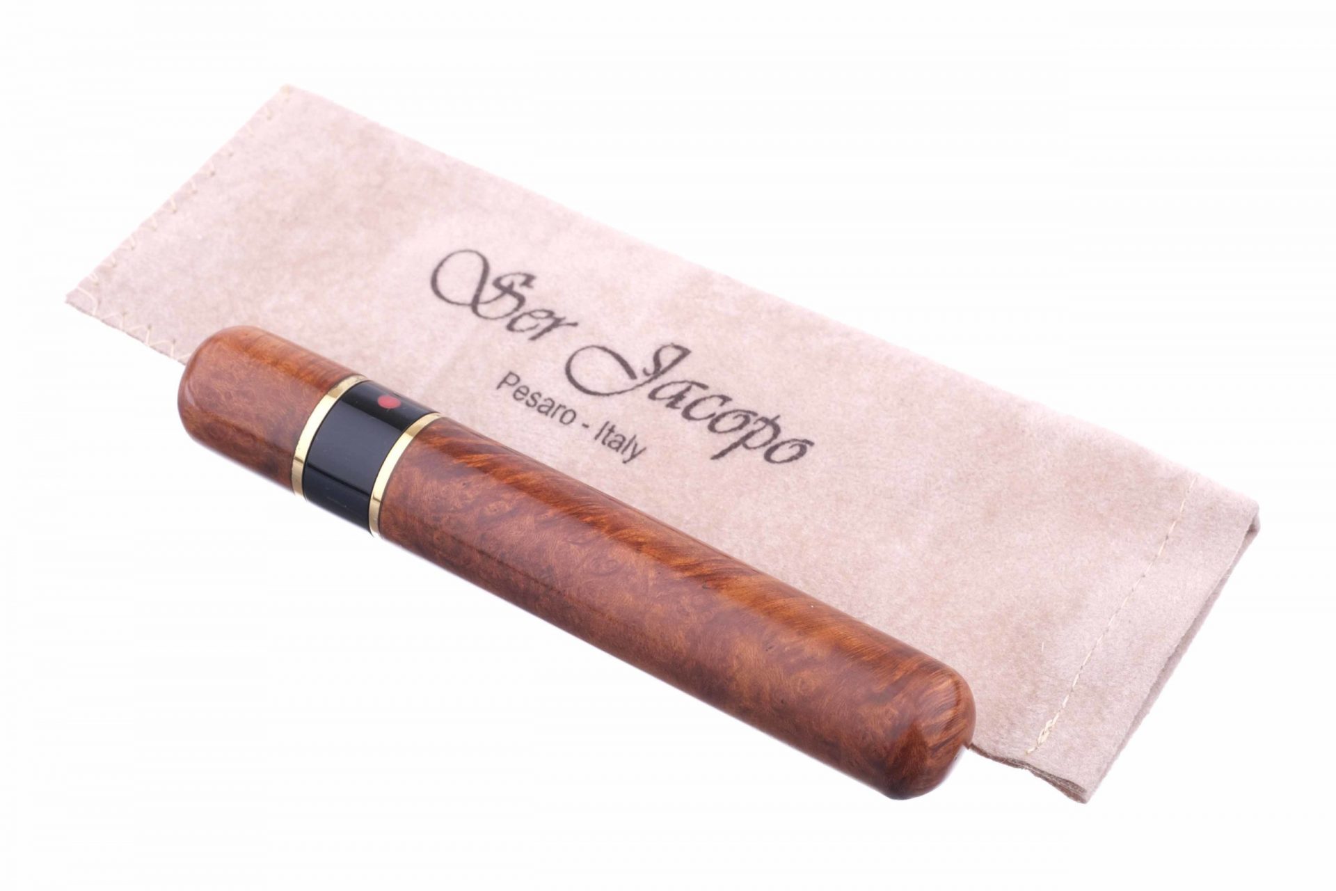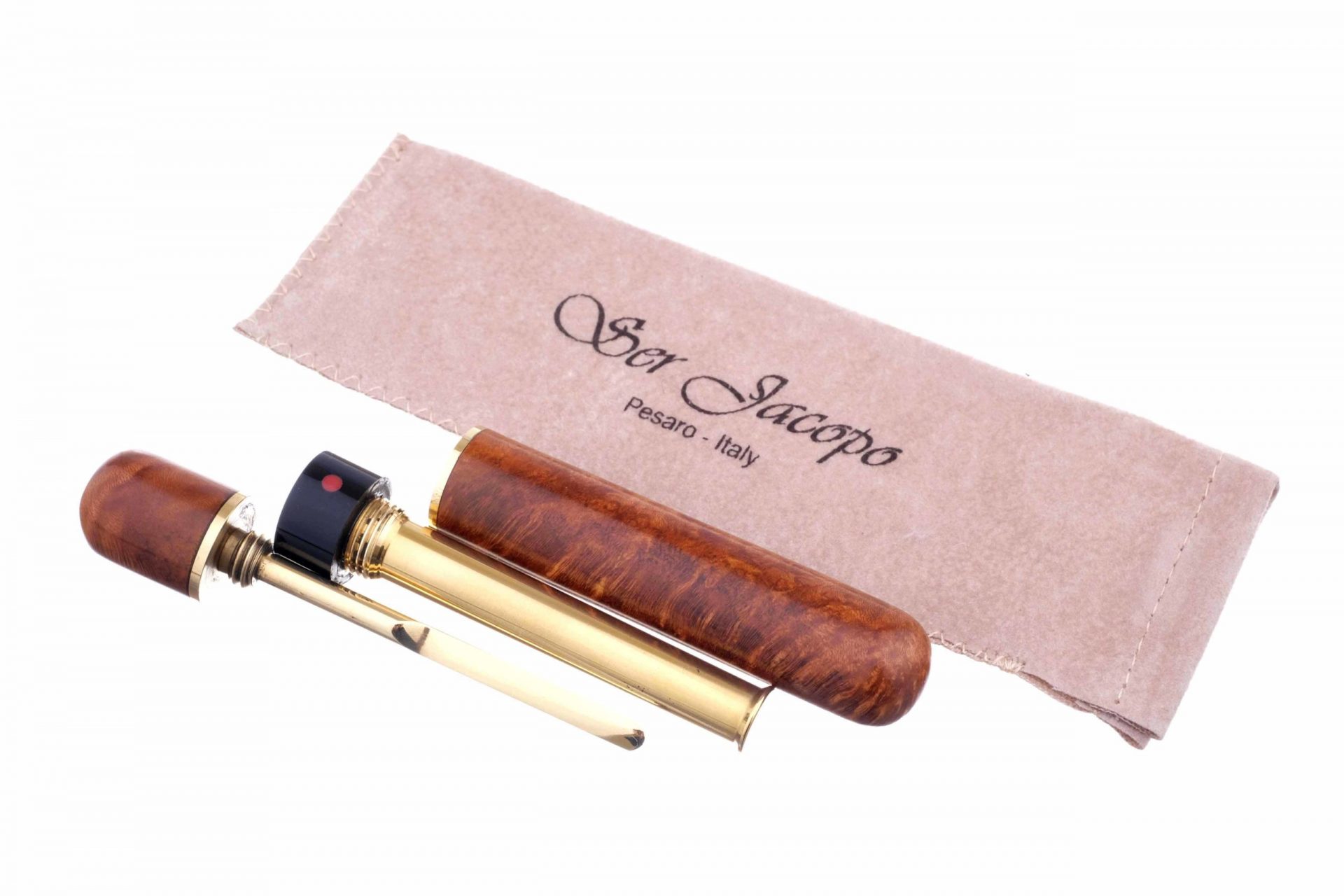 Инструмент для ухода за трубкой в подарочном исполнении из бриара и латуни. Штучная ручная работа итальянских трубочников из мастерской Ser Jacopo (www.serjacopo.it). Тампер для трамбовки спрятан внутри корпуса, чтобы не пачкать карман. Там же находится и лопатка для чистки или размешивания табака. Поставляется в фирменном кисете.