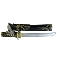 Танто "Медный Дракон". На касире изображен воин. Фути украшена японскими мотивами. Цуба сделана в виде расправленных крыльев дракона, а коигути представлена в виде головы дракона. Благодаря такому исполнению, создается образ красивого японского дракона, величественно расправившего свои крылья. Лезвие изготовлено из нержавеющей стали марки 420С (25 HRC) с высокотехнологичной обработкой (полировкой) и не заточено. Деревянные лакированные ножны (сая) черно-золотого цвета с сагео черно-коричневого цвета. Металлический кодзири украшен драконом.