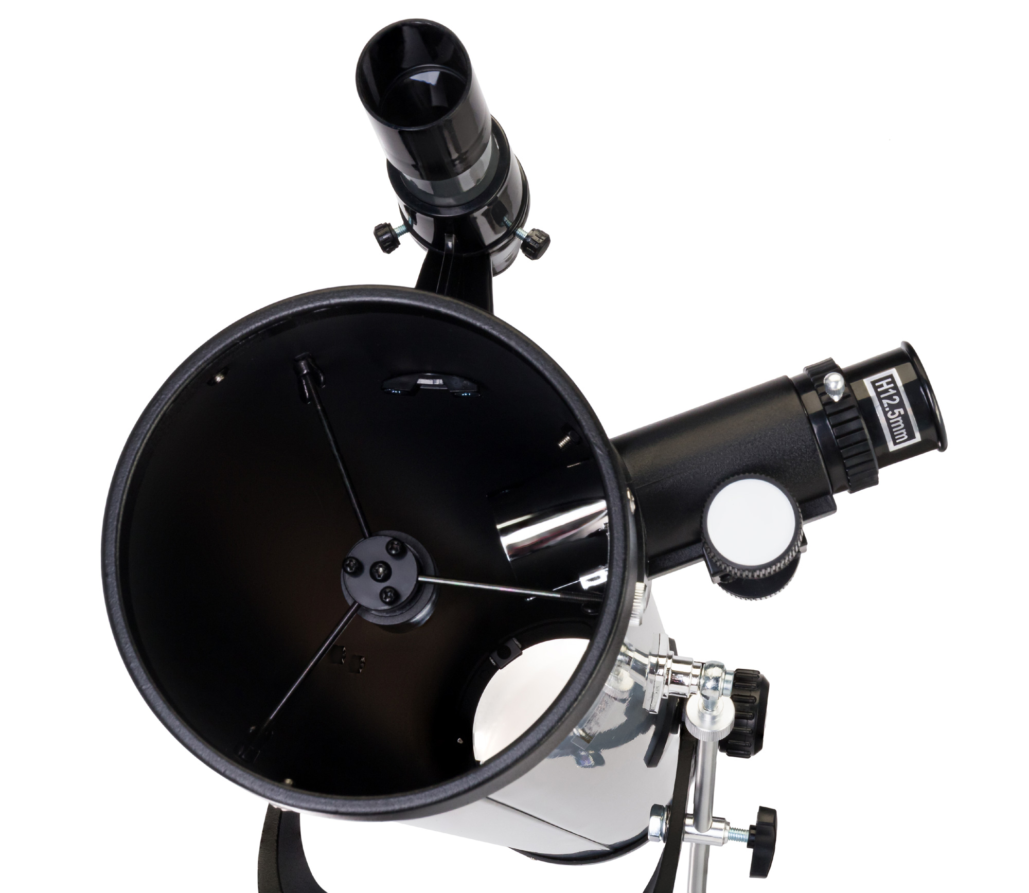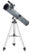 Вилочная азимутальная монтировка снабжена микровинтом, т. е. наводку на объект можно проводить очень точно. Алюминиевая тренога снабжена полочкой для аксессуаров, высоту треноги можно регулировать.