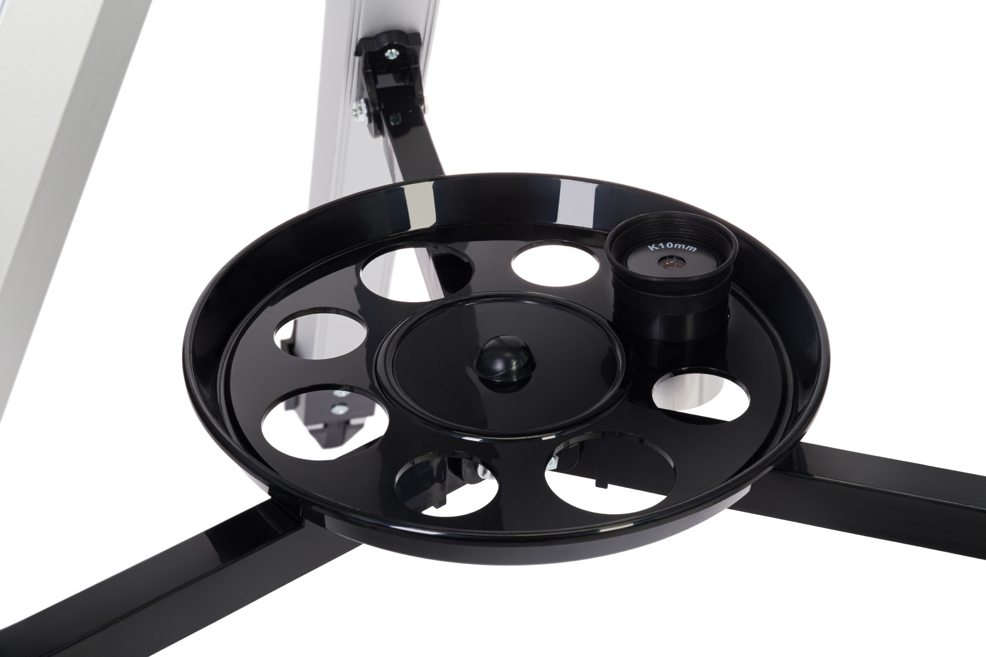 Тренога сделана из алюминия, ее высоту можно регулировать. В центр можно установить полочку для аксессуаров (в комплекте).