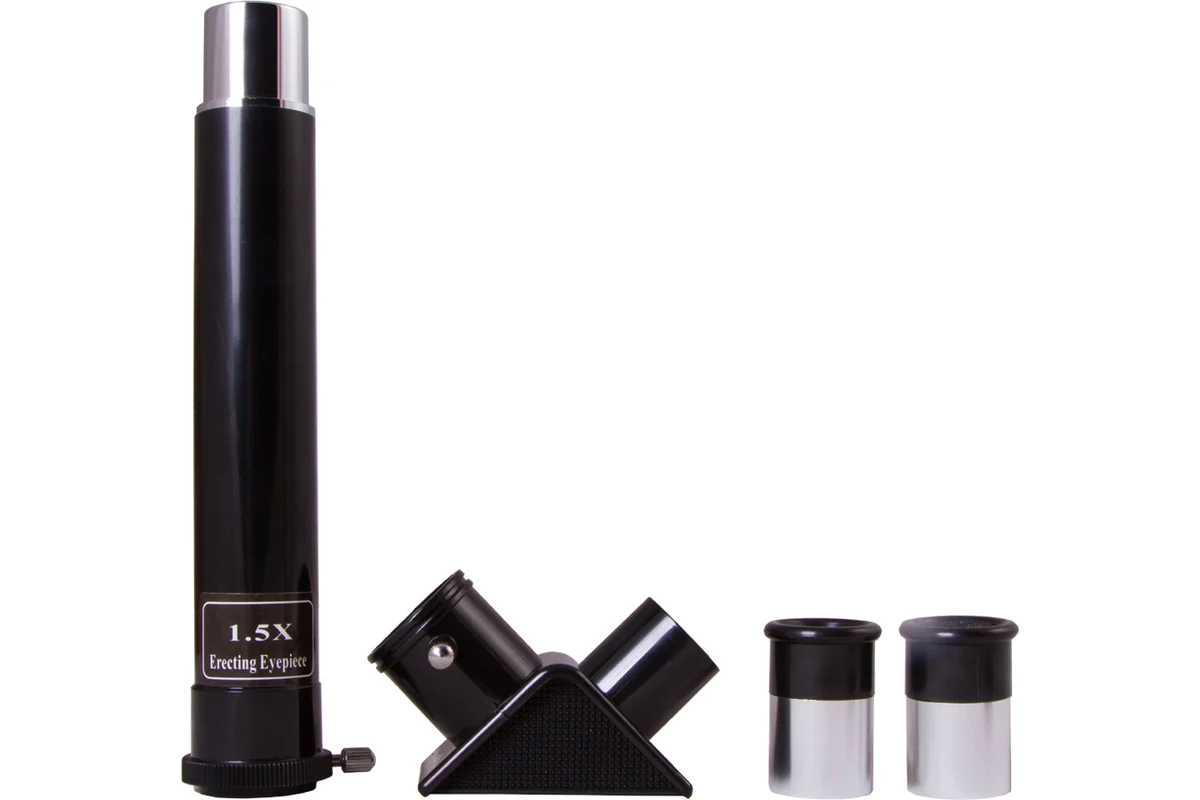 В базовую комплектацию телескопа уже входят два окуляра разной кратности. Прямо «из коробки» телескоп дает увеличение до 40 крат. Оборачивающий окуляр станет необходимым аксессуаром для тех, кто любит исследовать наземные объекты. Он формирует неперевернутое изображение и тоже включен в комплект поставки.