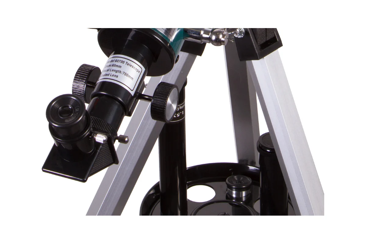 Вместе с телескопом вы получаете множество аксессуаров: окуляры разной кратности, линзу Барлоу 3х, диагональное зеркало, оборачивающий окуляр 1,5х. Во время наблюдений все аксессуары можно разместить на удобном лотке, который устанавливается на треногу. Тренога алюминиевая – легкая и устойчивая. Высота ее ножек регулируется.