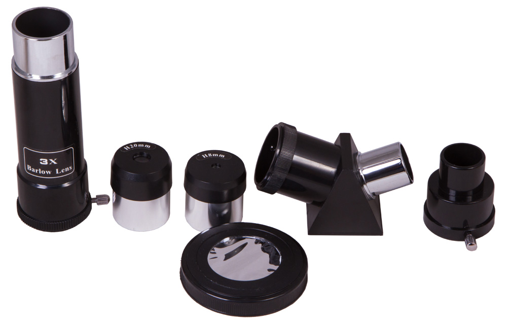 Апертура телескопа – 50 мм, на линзы нанесено полное многослойное просветляющее покрытие. Штатная диагональная призма строит прямое (неперевернутое) изображение, поэтому телескоп вполне может заменить зрительную трубу. Оптический прибор комплектуется всеми необходимыми аксессуарами: двумя окулярами 18x и 45x, линзой Барлоу 3x, диагональной призмой и безопасным солнечным фильтром. В комплекте также идет оптический искатель 2x. Максимальное полезное увеличение телескопа составляет 100x.