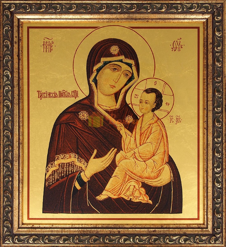 Икона Богородицы, почитаемая в Русской православной церкви чудотворной. Написана, по преданию, евангелистом Лукой. Икона существует в нескольких списках с иконы, находящихся в различных городах. Она стала, по сути, иконографическим подтипом образа Одигитрии (Путеводительницы), к примеру, списки вХраме Спаса на Сенной, Афанасьевском монастыре в Мологе.Относится к иконографическому типу икон Богородицы, носящему название Одигитрия, характерной особенностью которого является общение Пресвятой Девы с Младенцем Христом, их обращённость друг к другу. Изображение Богоматери поясное, Младенец сидит на левой руке Матери. Ноги Младенца согнуты в коленях и Его правая стопа находится под левой. В левой руке Он держит свиток, правой благословляет. Изображение Богоматери на Тихвинской иконе практически идентично Смоленской иконе Божией Матери, главное отличие в наклоне головы.Список иконы, хранившийся до 1941 в Тихвине, был и остается важнейшей святыней Новгородской земли и всего Русского государства. Ныне икона хранится в Тихвинском Богородичном Успенском монастыре. Празднование иконе совершается 26 июня (9 июля).Тихвинская икона Божией Матери считается покровительницей младенцев, ее называют детской. Она помогает детям в болезнях, успокаивает беспокойных и непослушных, помогает им в выборе друзей, ограждает от дурного влияния улицы. Считается, что она укрепляет связь между родителями и детьми. Женщинам помогает при родах и в период беременности. Также к Богородице перед Ее иконой «Тихвинская» обращаются с молитвой, когда существуют проблемы зачатия.