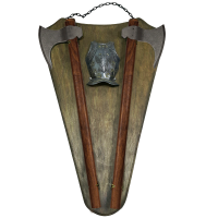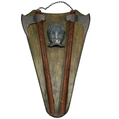 Трофей в виде настенного декоративного предмета, состоящий из деревянного щита и двух топоров Рагнара. Изделие предназначено для фиксации на внутренней/внешней стене. Топоры выполнены в присущим им, скандинавском выдержанном стиле. Товар воплощает в себе Дух Великого Короля Рагнара