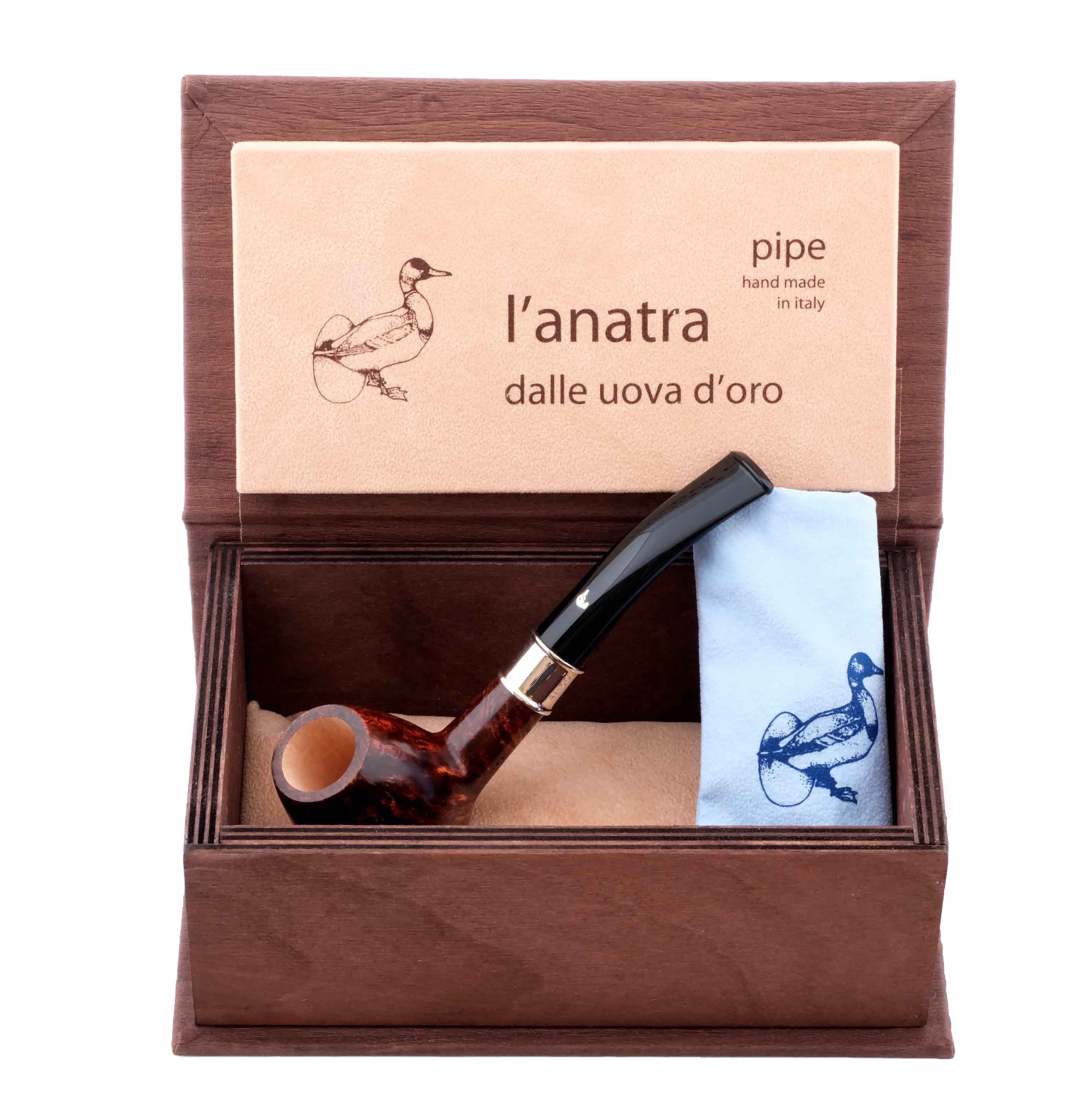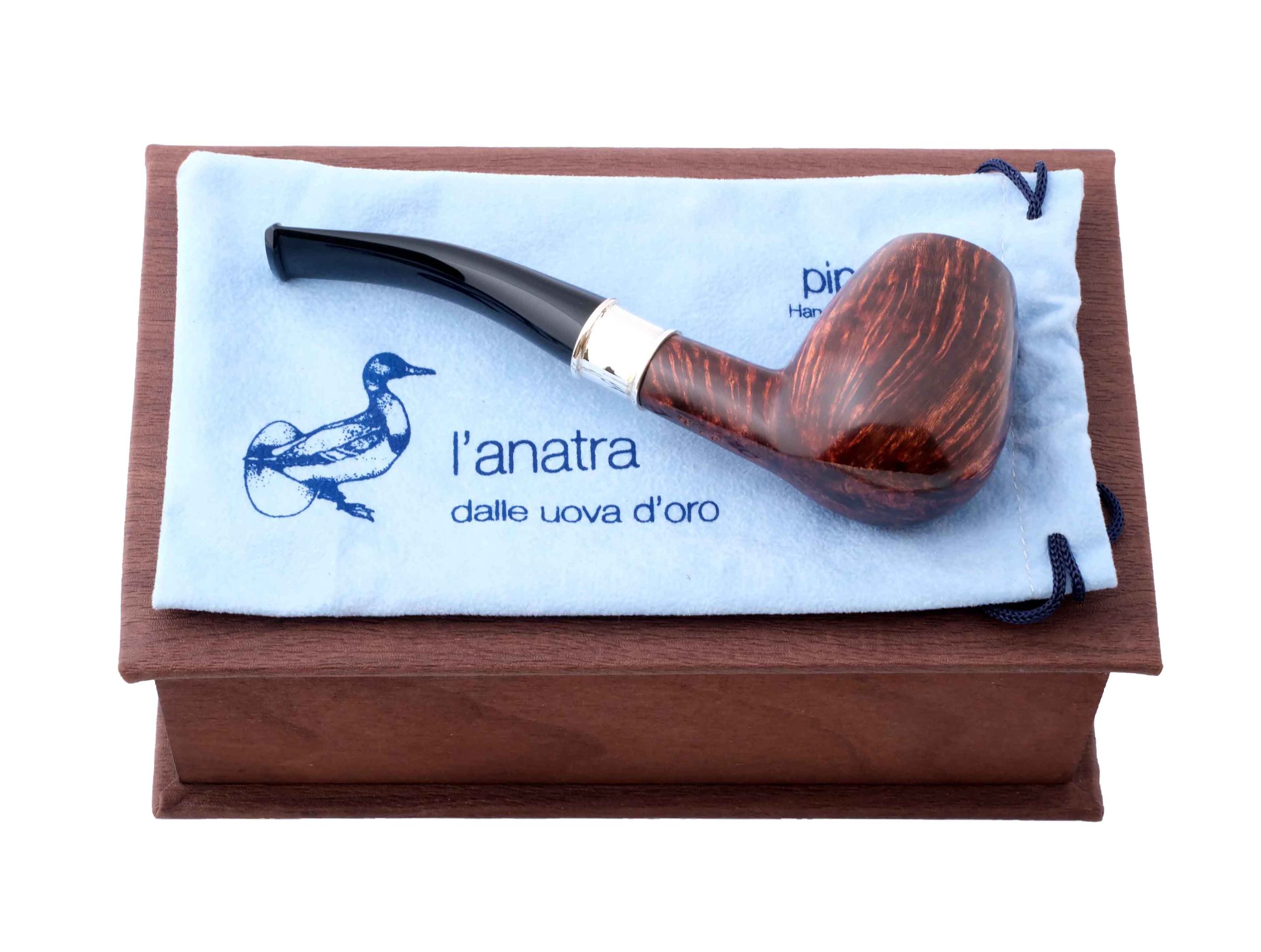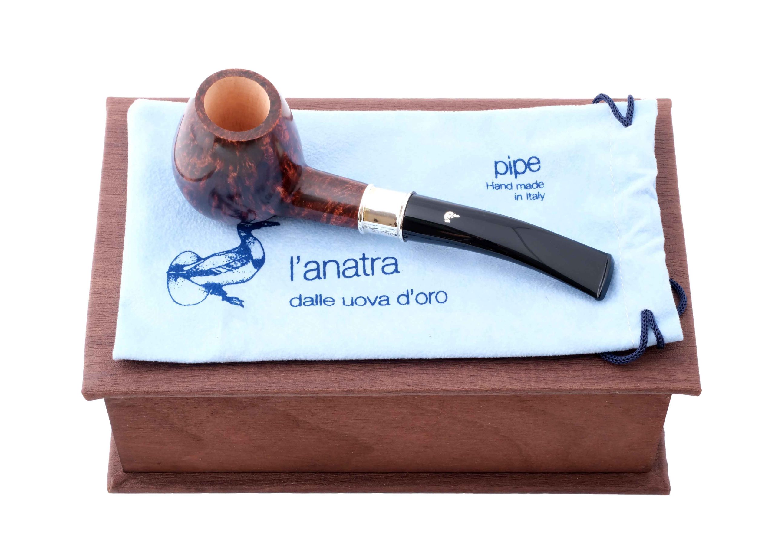 На мундштуке нанесен символ компании — серебряная голова утки и на чубуке выбит девиз L’Anatra dalle uova d’oro — «Утка несущая золотые яйца» и Hand made in Italy.