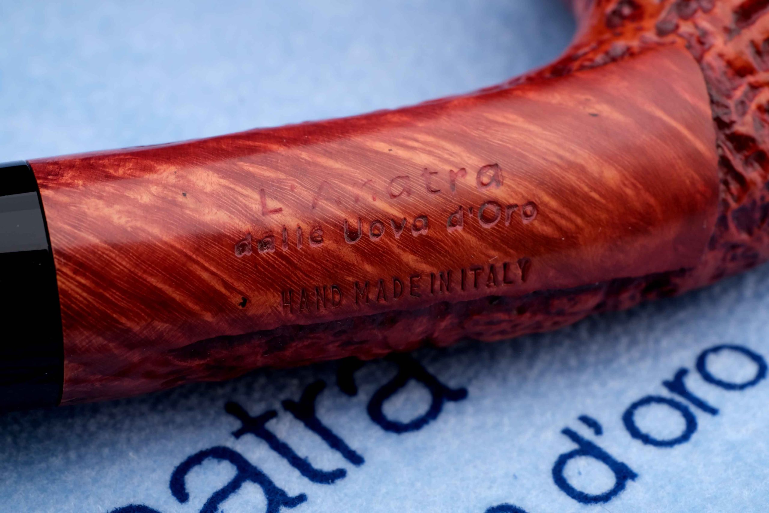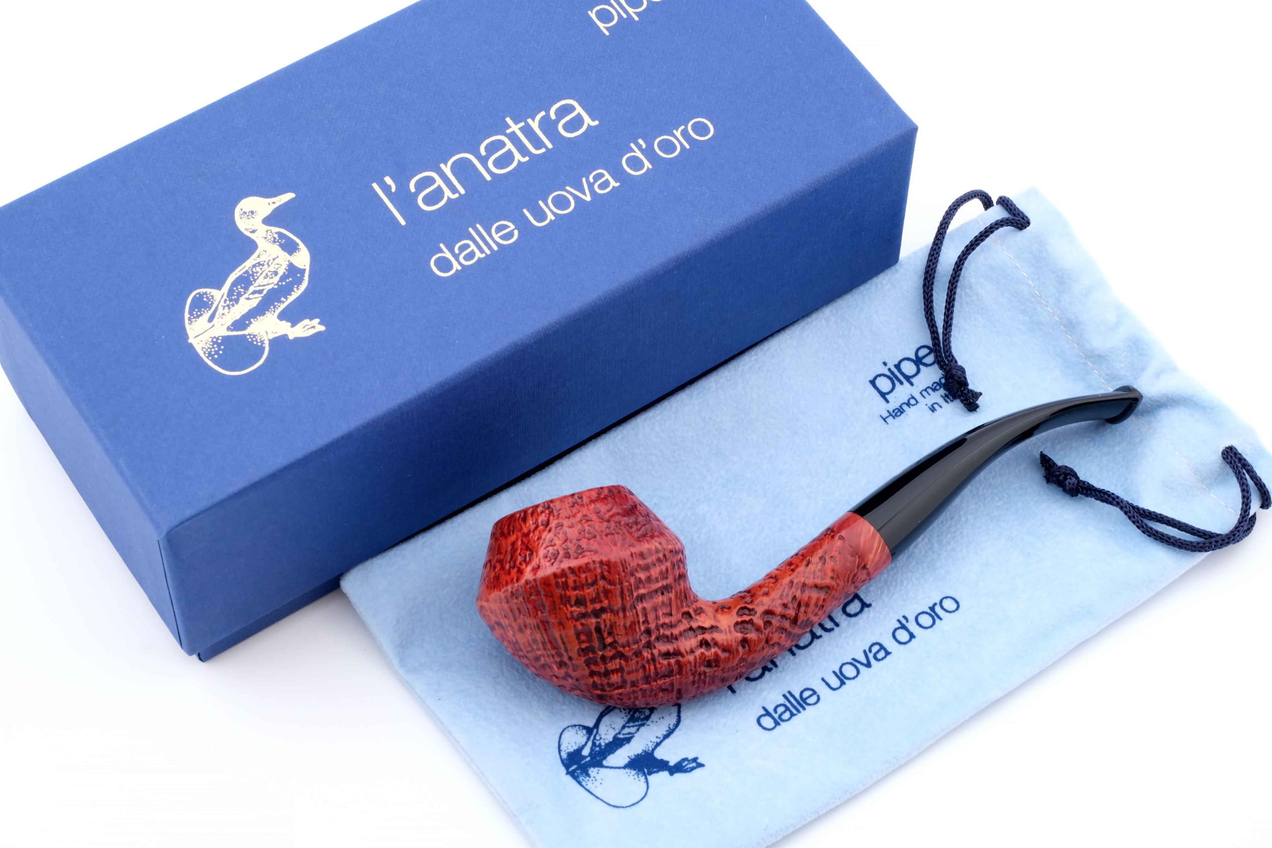 Легкая курительная трубка L’Anatra с отделкой Сэндбласт (когда мощная струя измельченного в песок стекла выбивает мягкие частицы корнекапа, оставляя твердые капилляры и придавая осязаемый объем натуральному рисунку бриара, площадь поверхности трубки при этом увеличивается, что способствует лучшему охлаждению чаши и более приятному «прохладному» курению, также снижается и вес трубки).