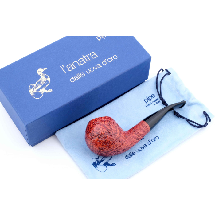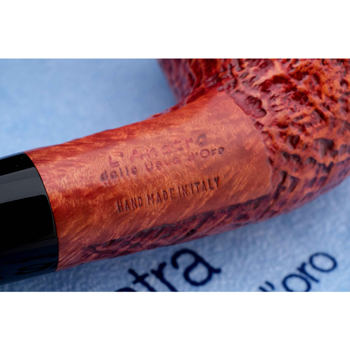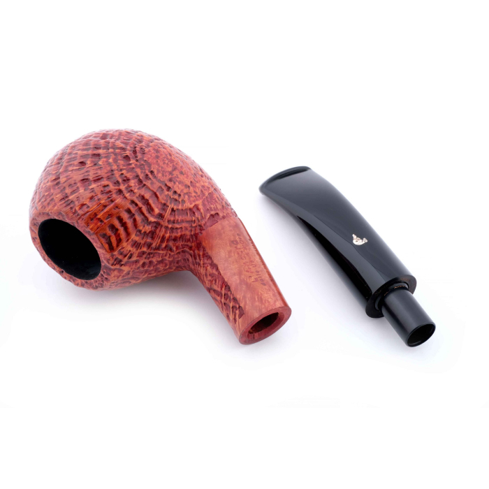 Авторская курительная трубка L’Anatra с отделкой Сэндбласт (когда мощная струя измельченного в песок стекла выбивает мягкие частицы корнекапа, оставляя твердые капилляры и придавая осязаемый объем натуральному рисунку бриара, площадь поверхности трубки при этом увеличивается, что способствует лучшему охлаждению чаши и более приятному «прохладному» курению, также снижается и вес трубки).