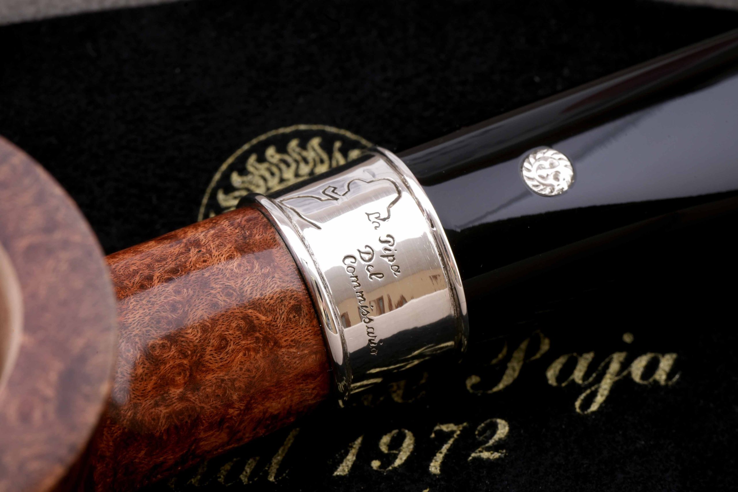 Трубка La Pipa Del Commissario посвящена комиссару Мегрэ - мудрому полицейскому сыщику, герою популярной серии детективных романов и рассказов Жоржа Сименона. Распутывать сложные дела ему помогала неизменная трубка формы "прямой Бильярд". Подобную модель и воссоздали в мастерской Мастро де Пайа, украсив кольцо гравировкой с абрисом Мегрэ и надписью "Трубка Комиссара".