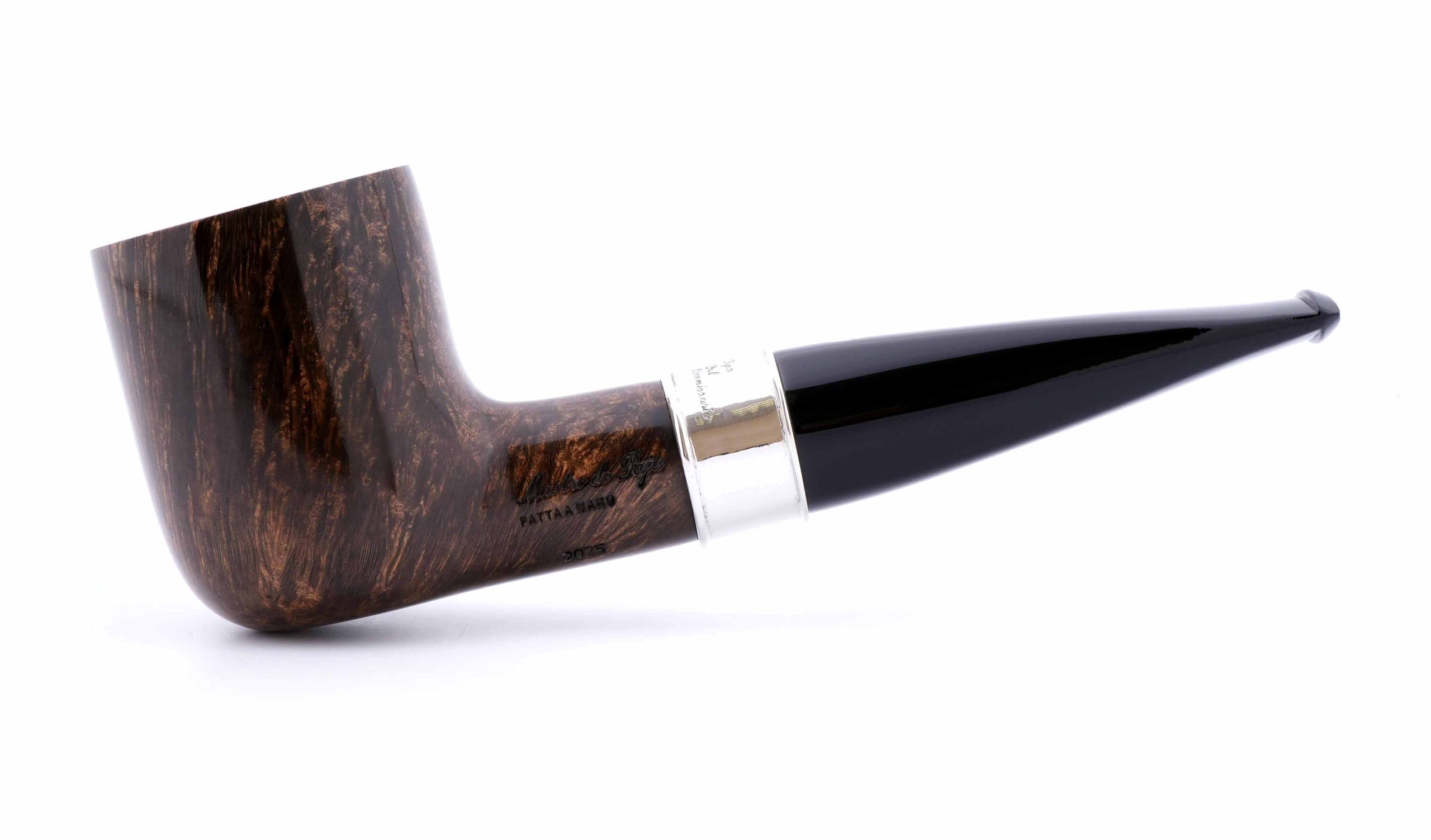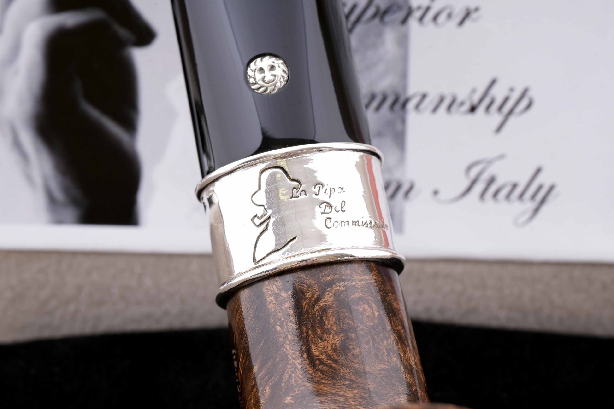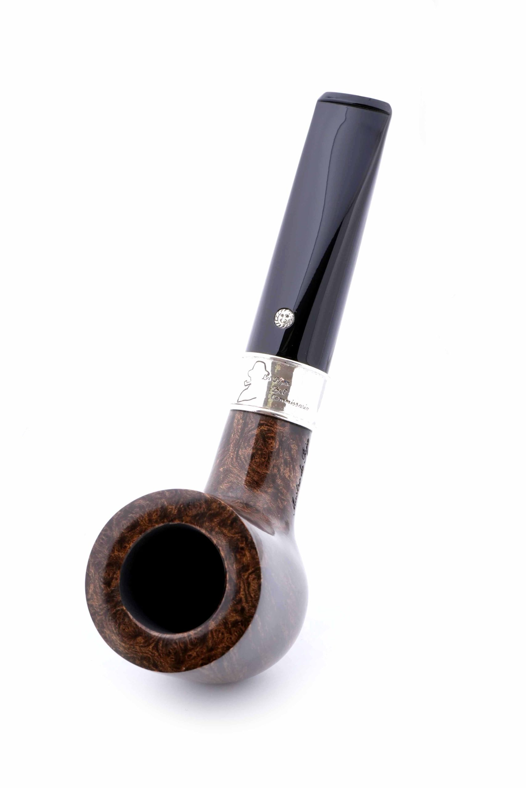 Трубка La Pipa Del Commissario посвящена комиссару Мегрэ - мудрому полицейскому сыщику, герою популярной серии детективных романов и рассказов Жоржа Сименона. Распутывать сложные дела ему помогала неизменная трубка формы "прямой Бильярд". Подобную модель и воссоздали в мастерской Мастро де Пайа, украсив кольцо гравировкой с абрисом Мегрэ и надписью "Трубка Комиссара".