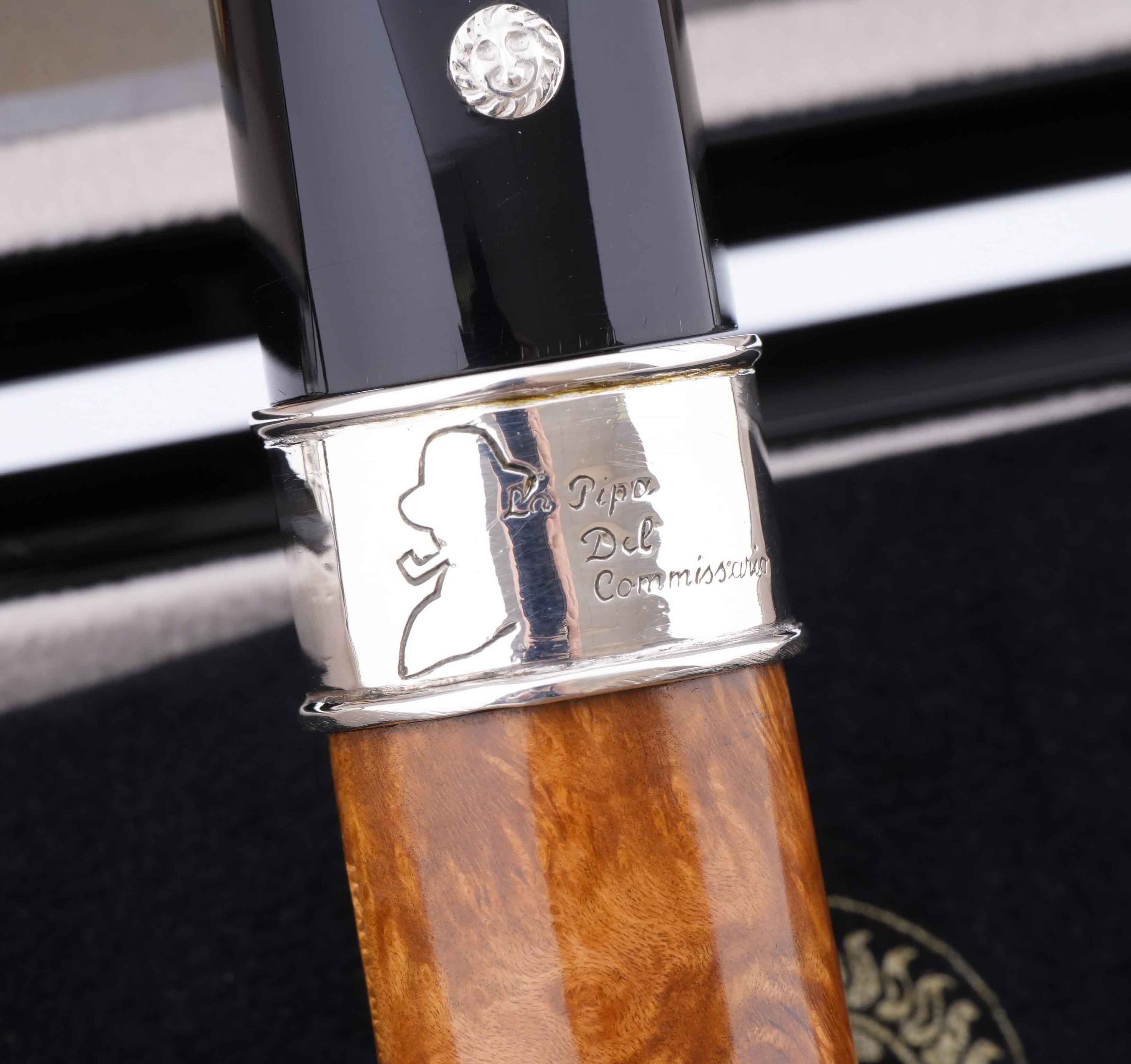 Трубка La Pipa Del Commissario посвящена комиссару Мегрэ - мудрому полицейскому сыщику, герою популярной серии детективных романов и рассказов Жоржа Сименона. Распутывать сложные дела ему помогала неизменная трубка формы "прямой Бильярд". Подобную модель и воссоздали в мастерской Мастро де Пайа, украсив кольцо гравировкой с абрисом Мегрэ и надписью "Трубка Комиссара".