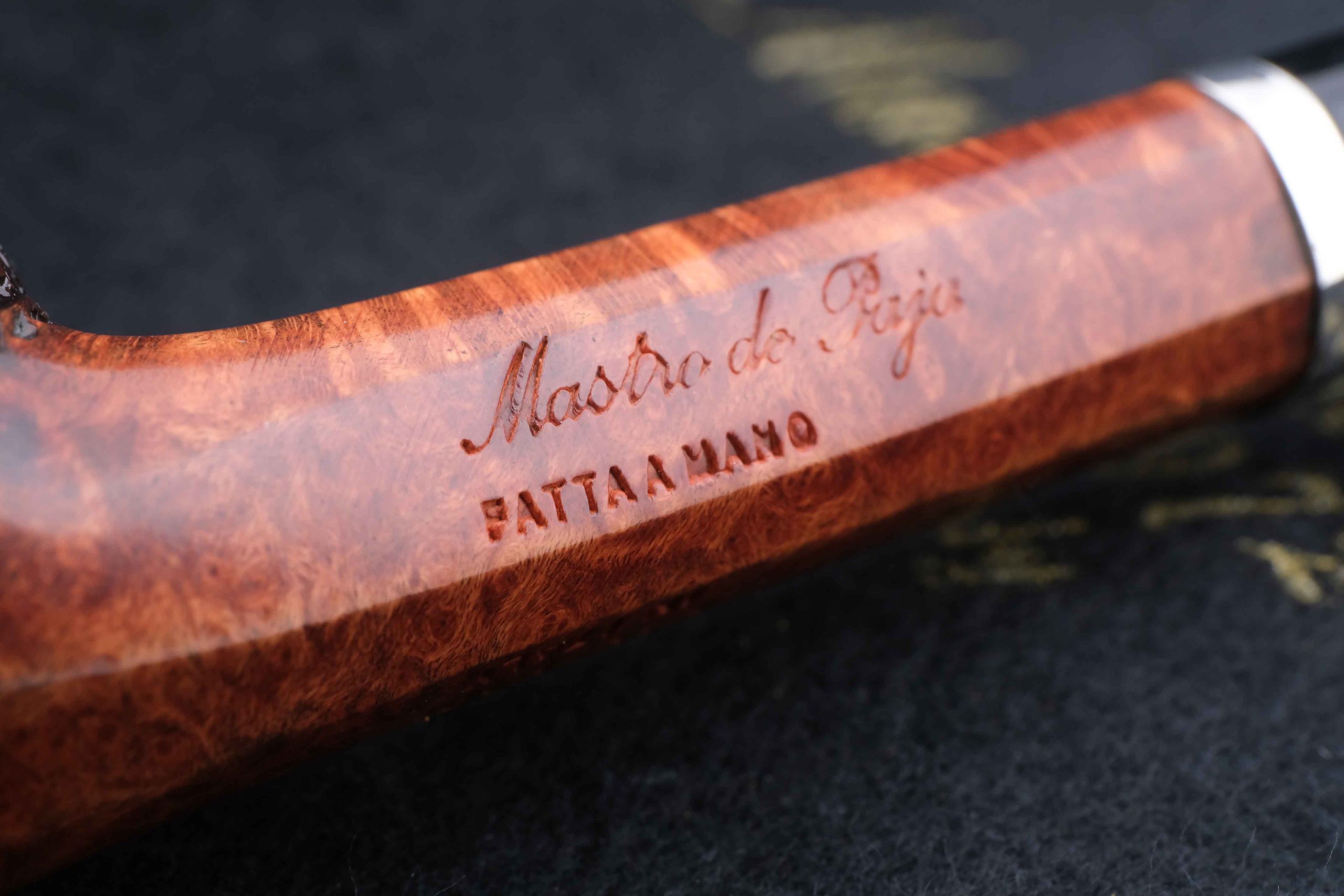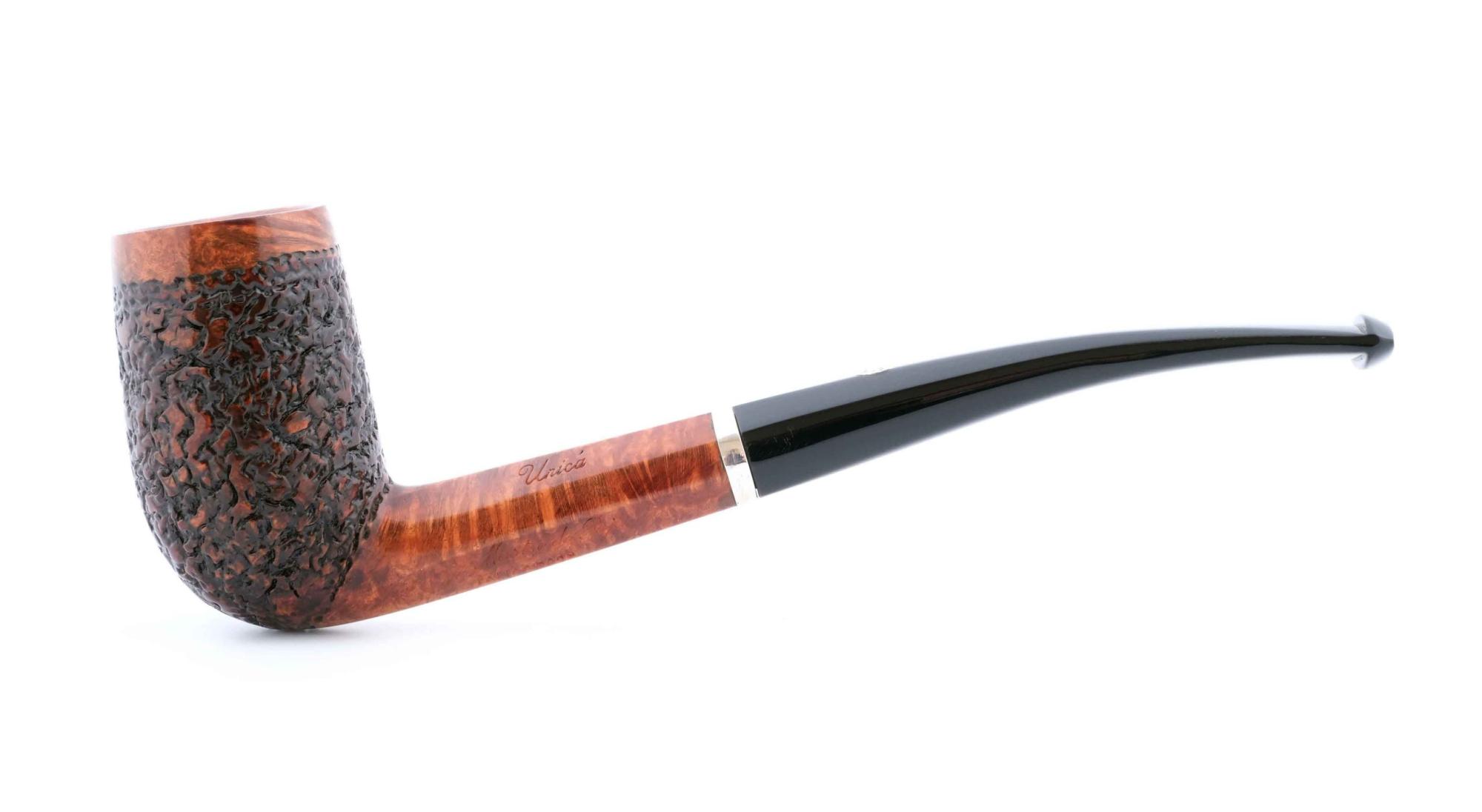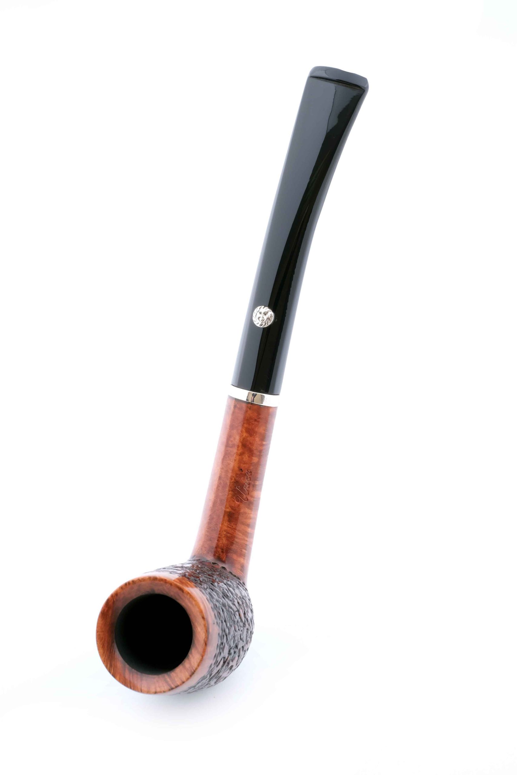 Суперлегкая трубка из мастерской Мастро де Пайа. Принадлежит к лимитированной серии Unica, где каждый экземпляр неповторим, имея свой индивидуальный дизайн. Рустирование придает объем и увеличение поверхности охлаждения чаши.