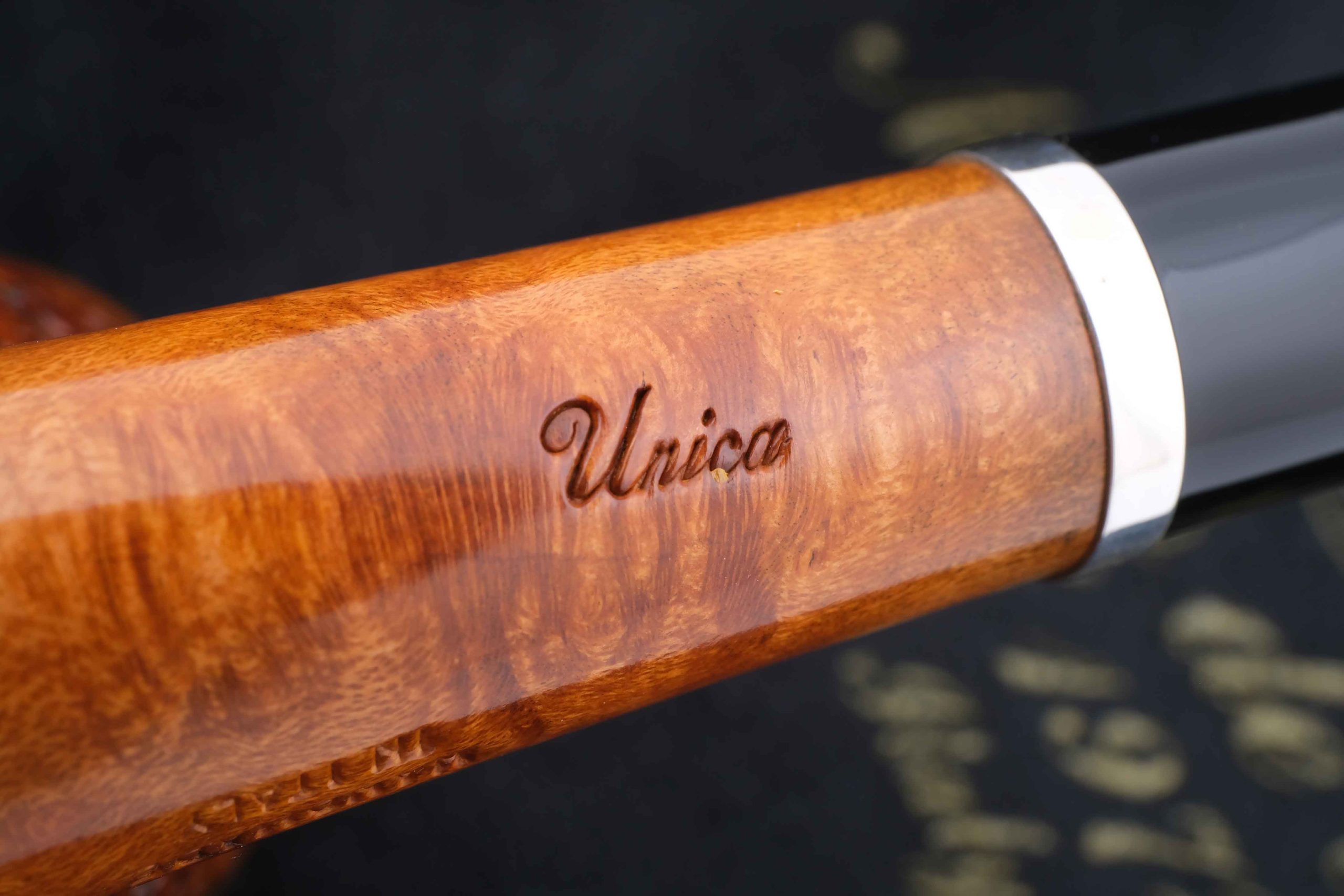 Классическая легкая трубка из мастерской Мастро де Пайа. Принадлежит к лимитированной серии Unica, где каждый экземпляр неповторим, имея свой индивидуальный дизайн. Рустировка придает объем и увеличение поверхности охлаждения в дополнение к натуральному рисунку бриара на чаше.