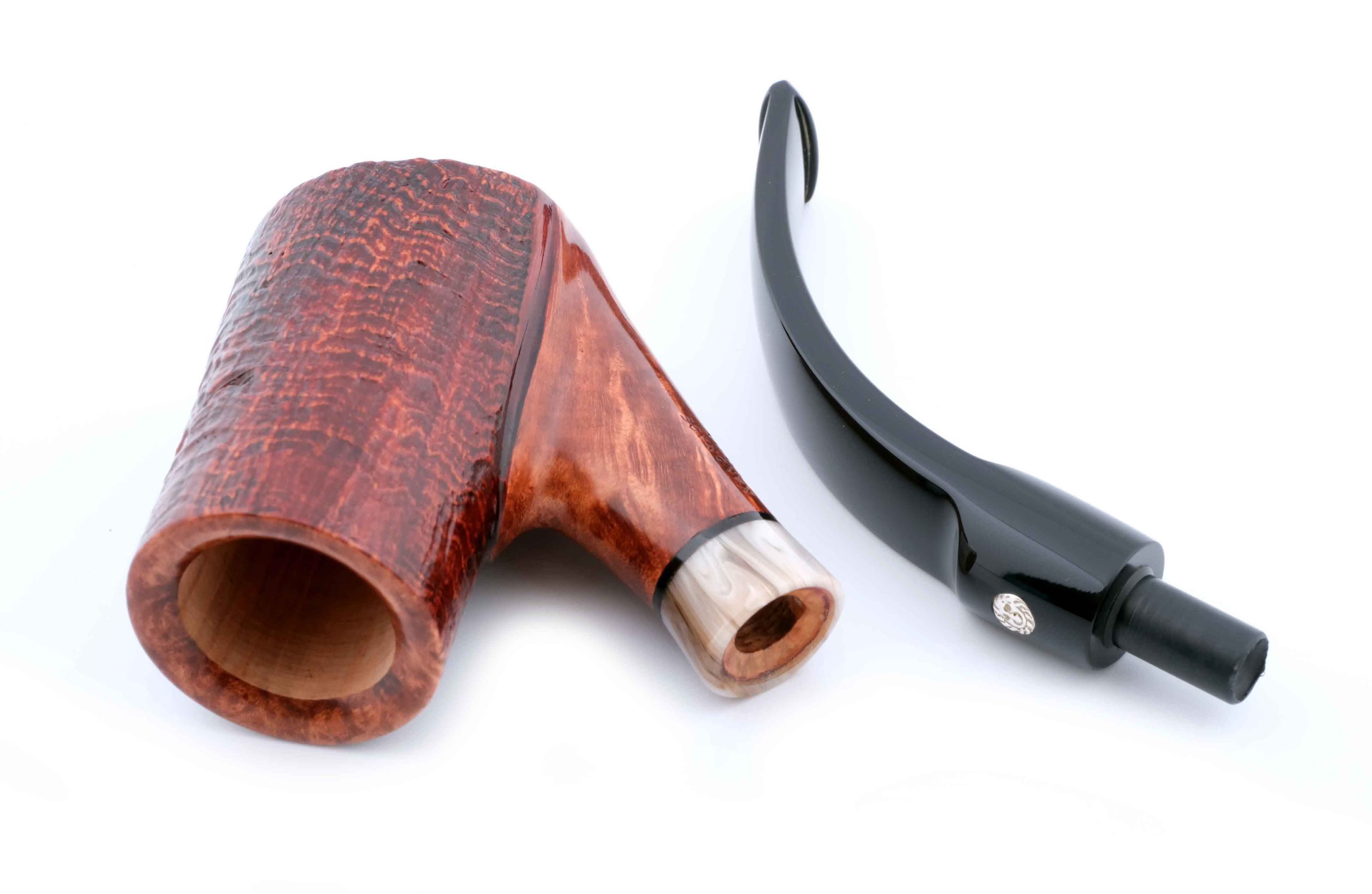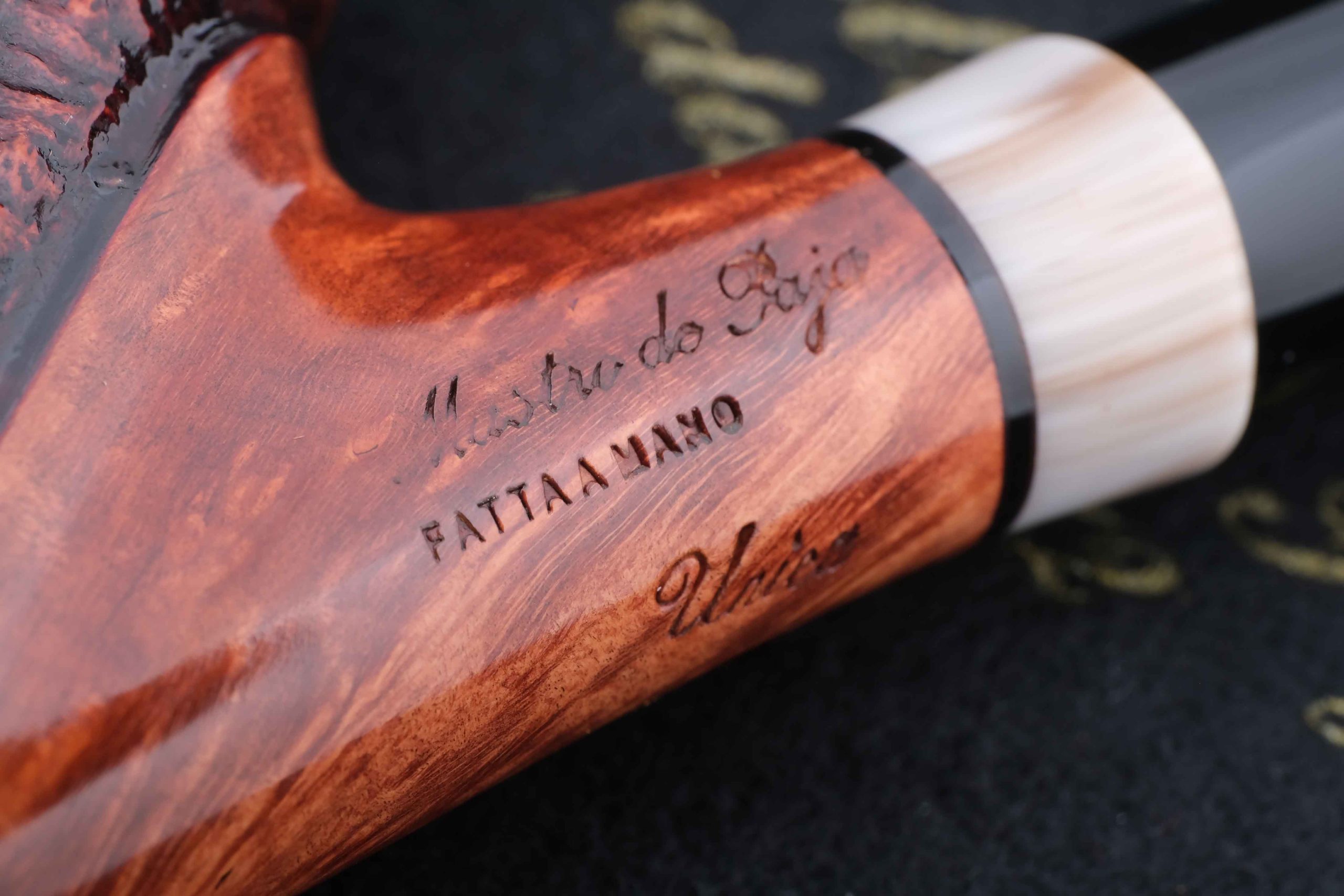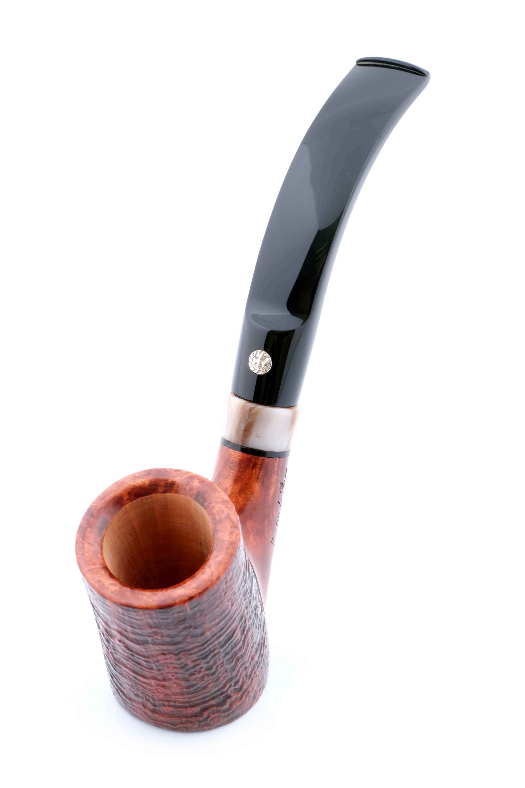 Легкая изящная трубка модели Stand-Up из мастерской Мастро де Пайа. Принадлежит к лимитированной серии Unica, где каждый экземпляр неповторим, имея свой индивидуальный дизайн. Кольцо на чубуке - олений рог.