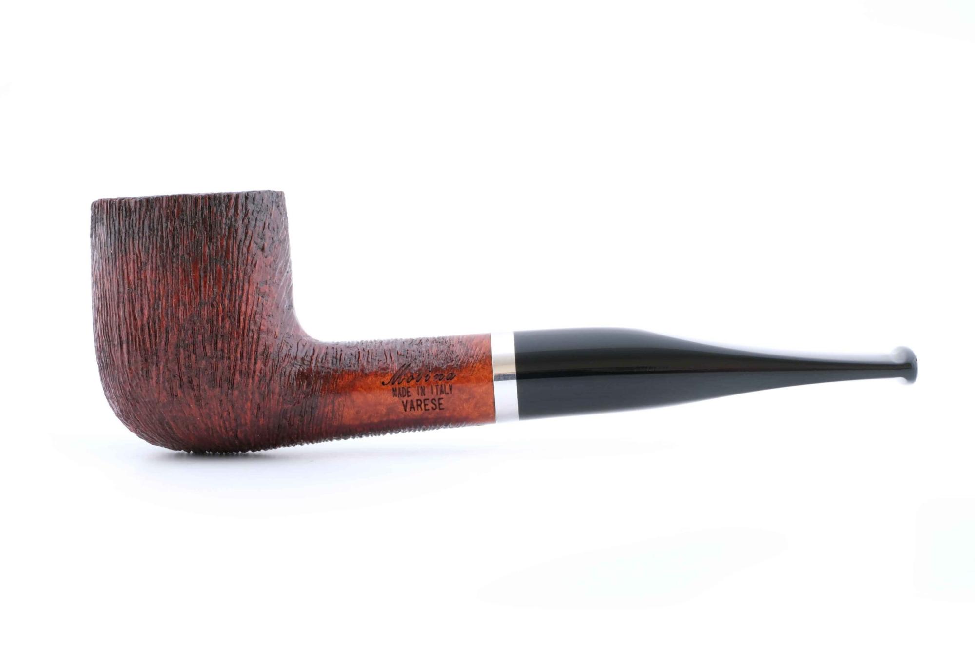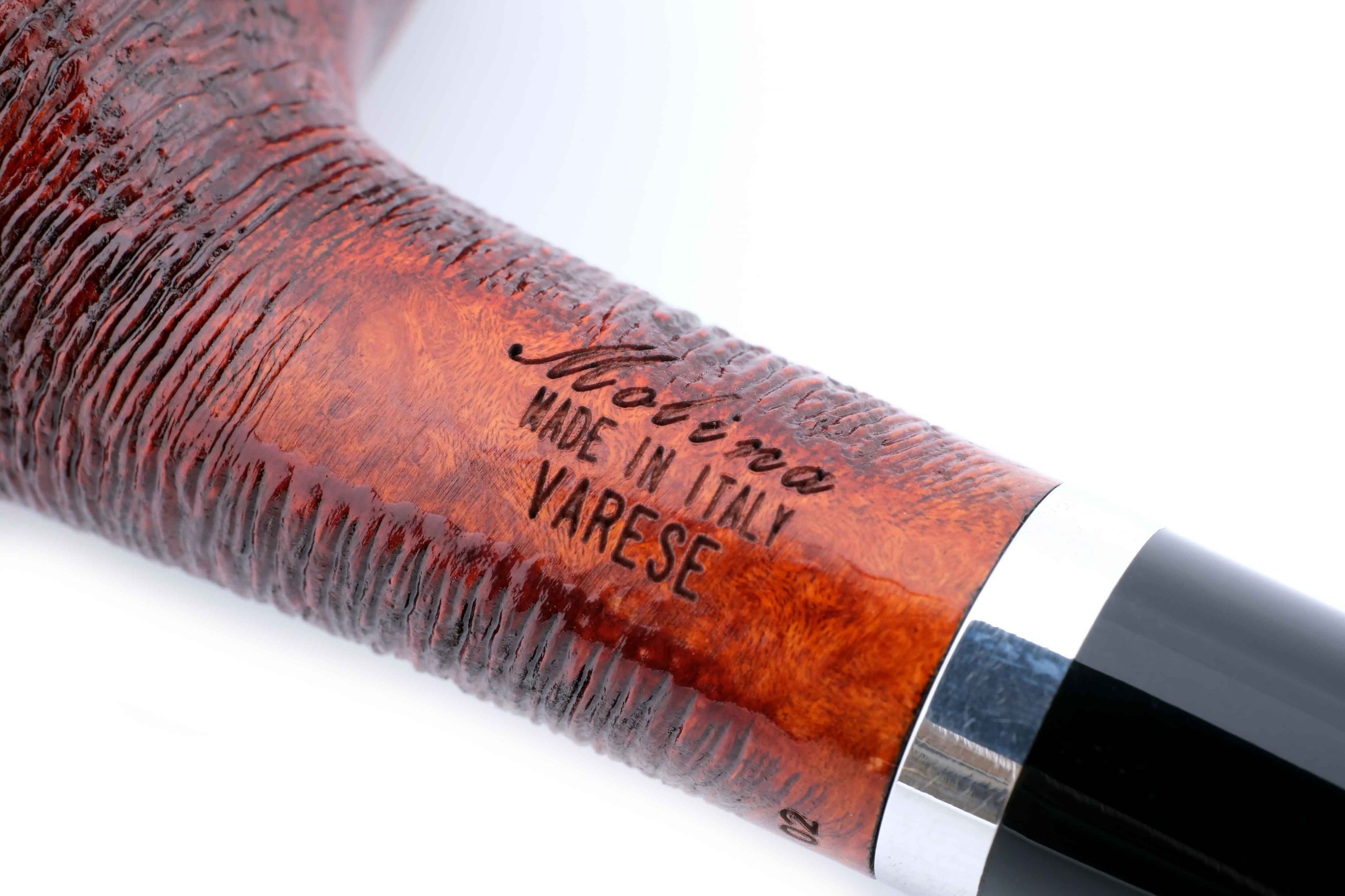 Трубка серии Varese от одного из старейших производителей курительных трубок в Италии - мастерской Molina из города Варезе в Ломбардии. Внешняя отделка Pettinata ("расческа", ит.) - особая техника мелкого рустирования, придающая поверхности шелковистый вид "причесанного" меха. Трубка приятно держится в руке, а увеличенная за счет рустирования площадь поверхности способствует лучшему охлаждению трубки при курении.
