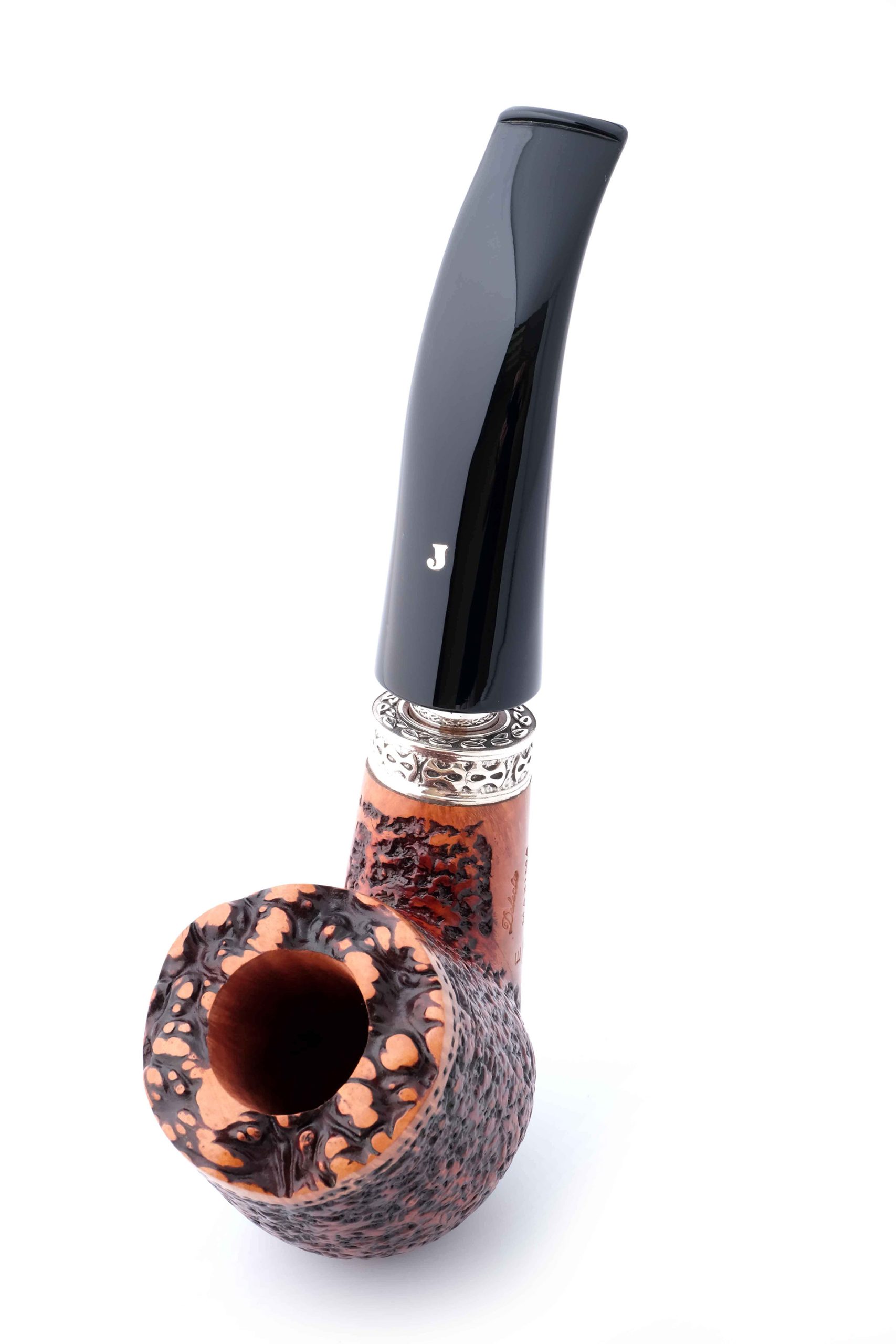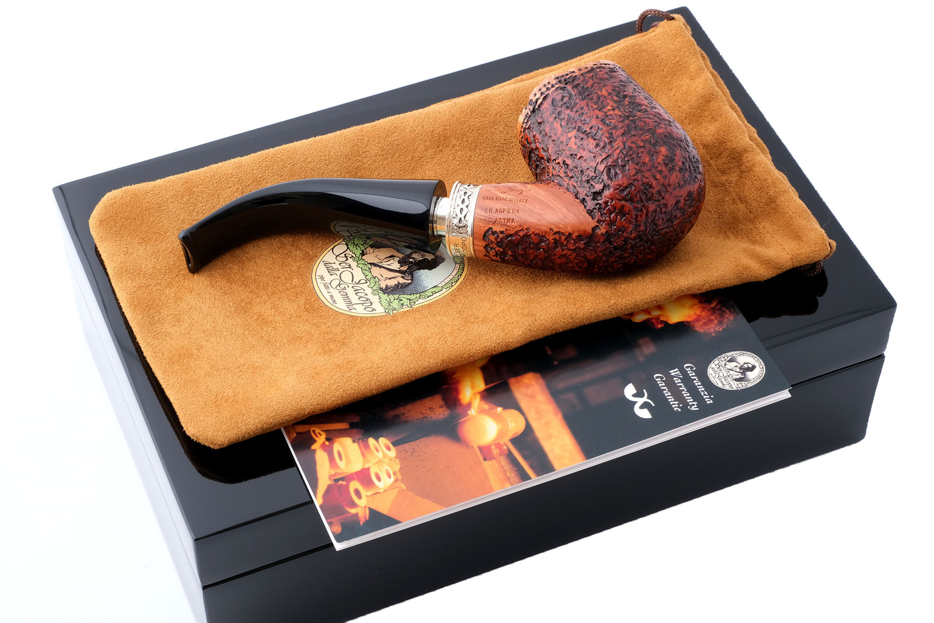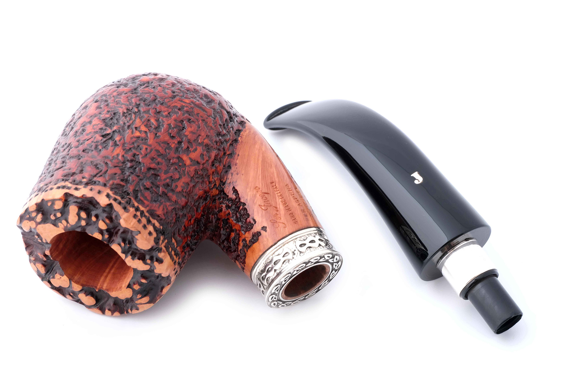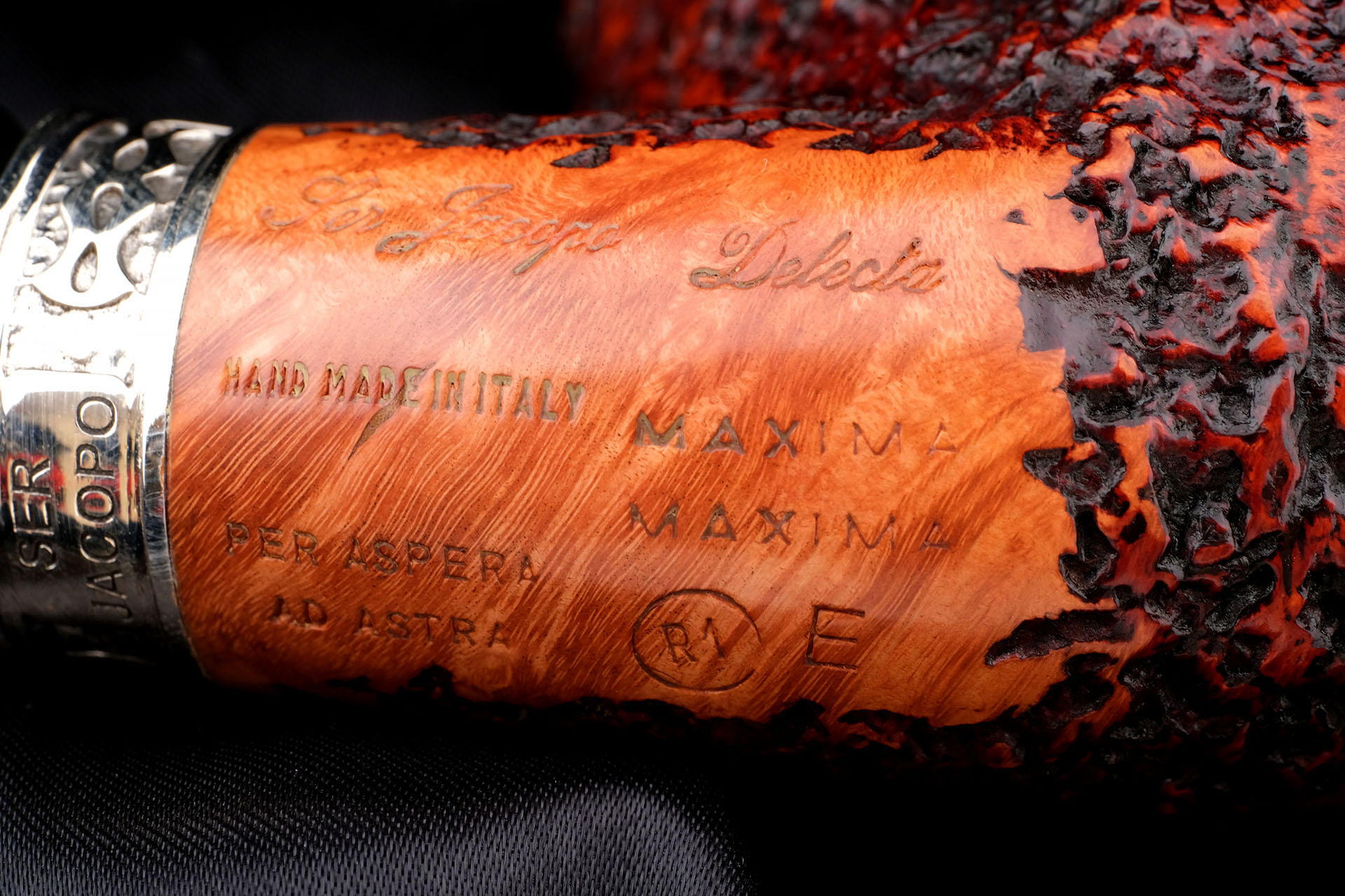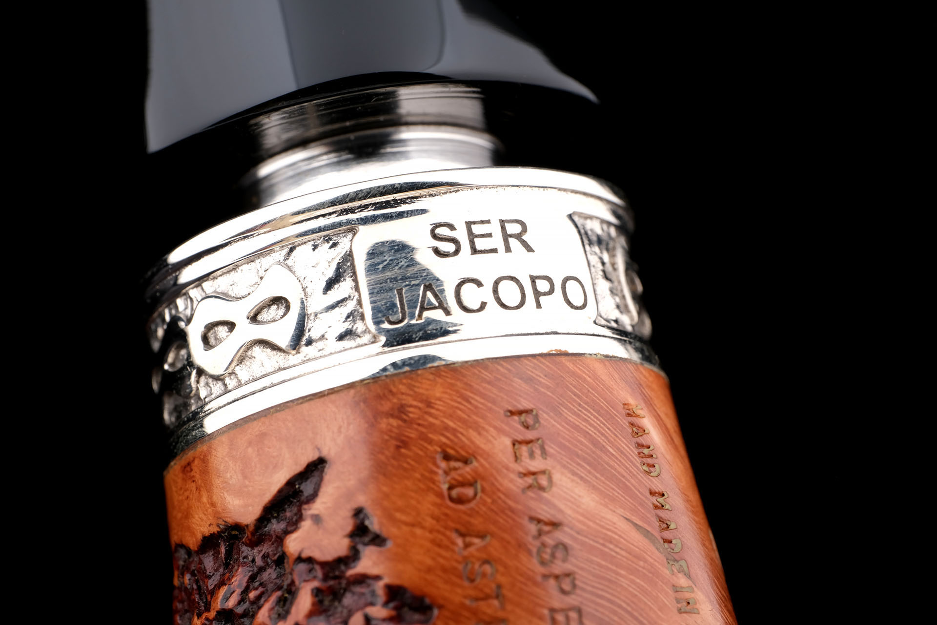 На трубке выбит девиз мастерской Ser Jacopo «PER ASPERA AD ASTRA» ( Через тернии к звездам, лат.), маркировки: Ser Jacopo, De Divina Proporzione, Hand made in Italy, грэйд R1 E.