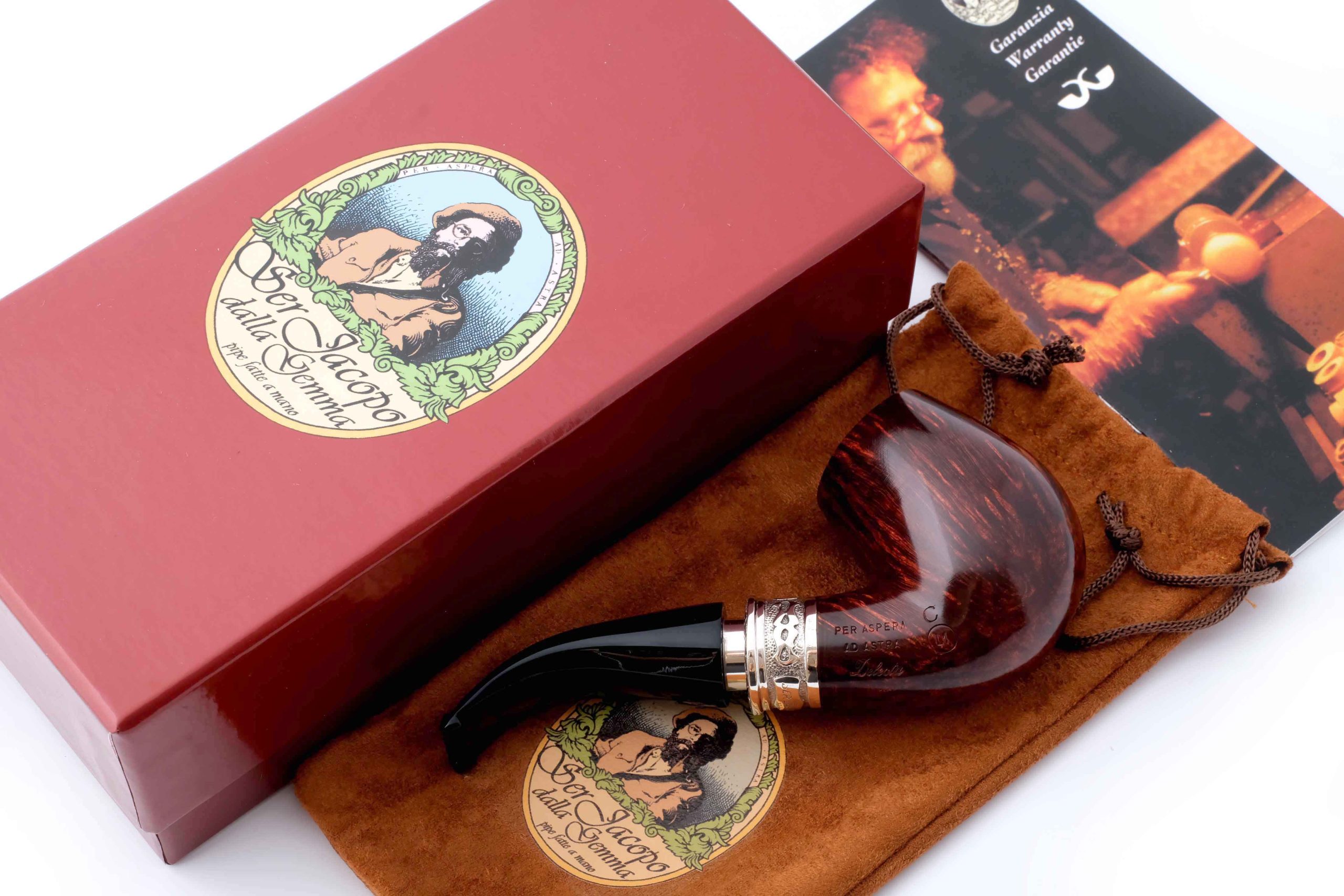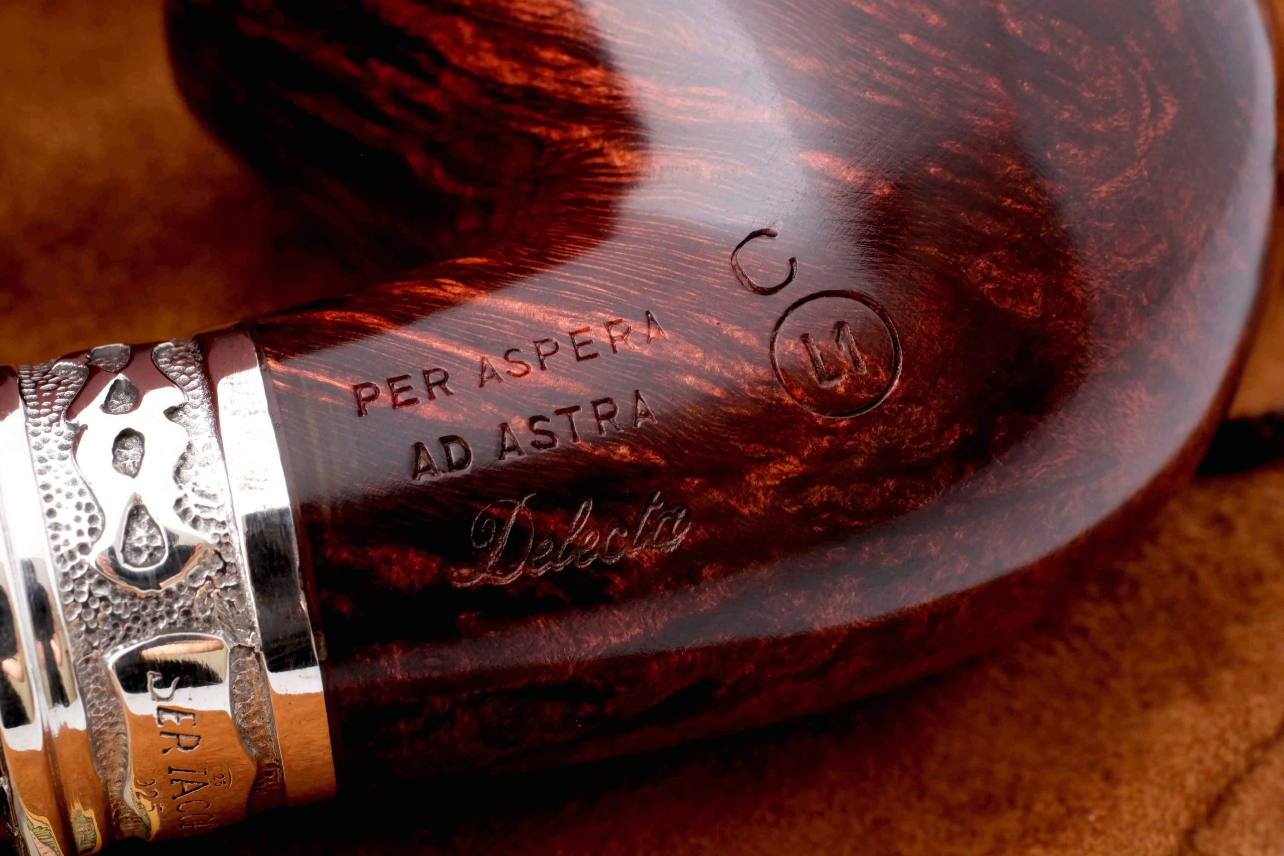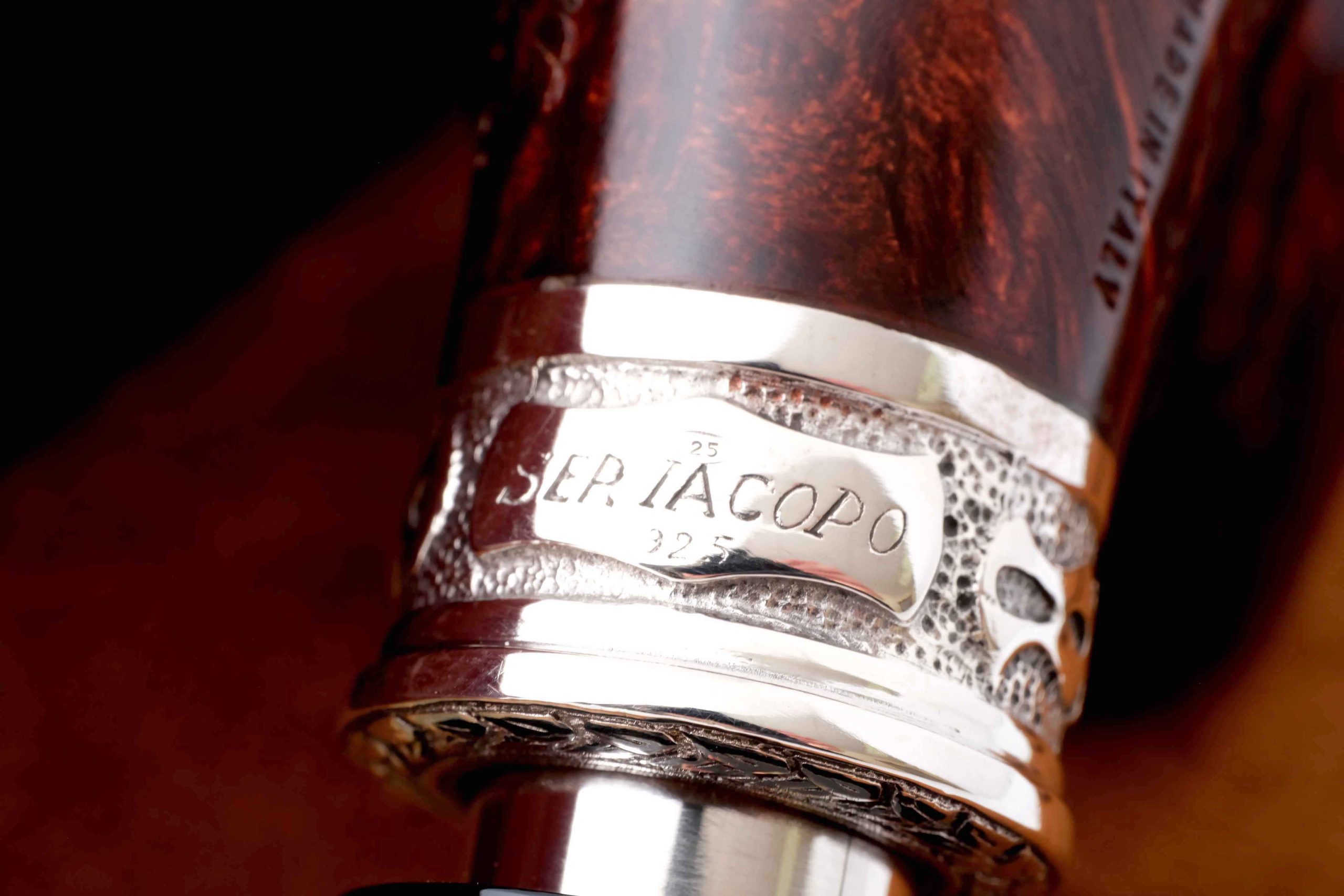 На трубке выбит девиз мастерской Ser Jacopo PER ASPERA AD ASTRA («Через тернии к звездам», лат.), маркировки: Ser Jacopo, Hand made in Italy, грэйд L1 C.