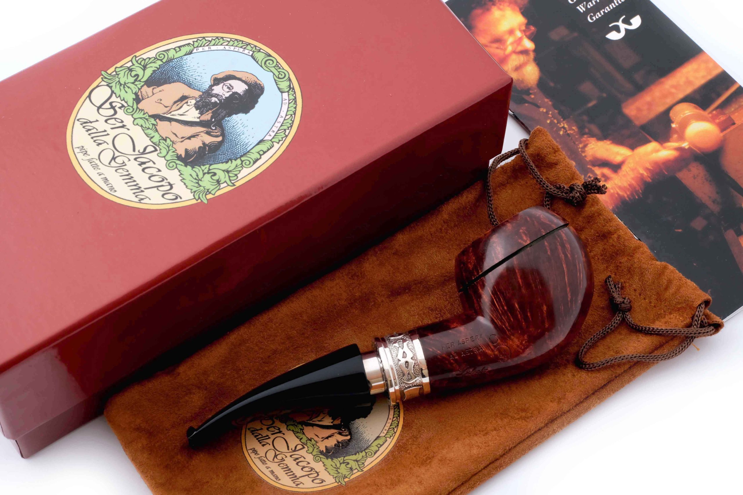 На трубке выбит девиз мастерской Ser Jacopo PER ASPERA AD ASTRA («Через тернии к звездам», лат.), маркировки: Ser Jacopo, Hand made in Italy, грэйд L1 C.