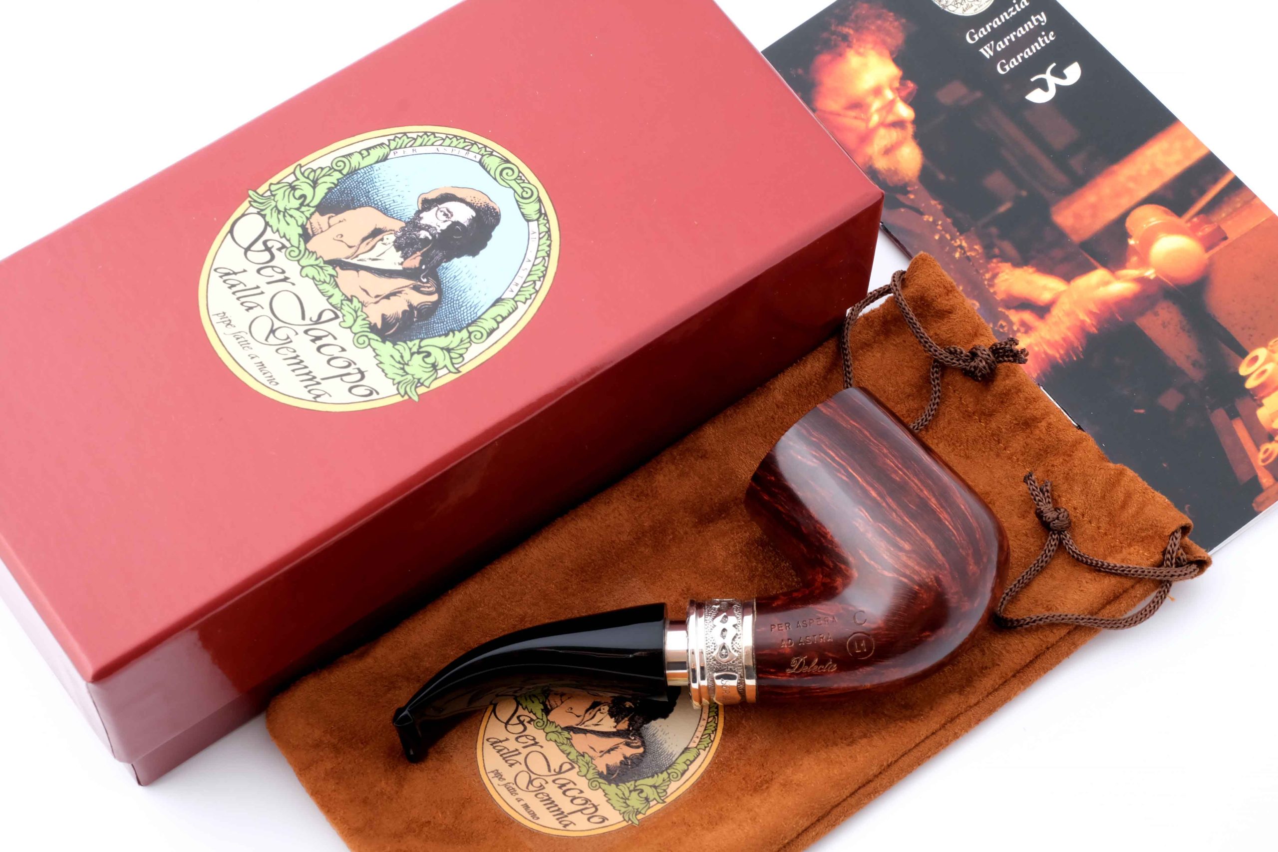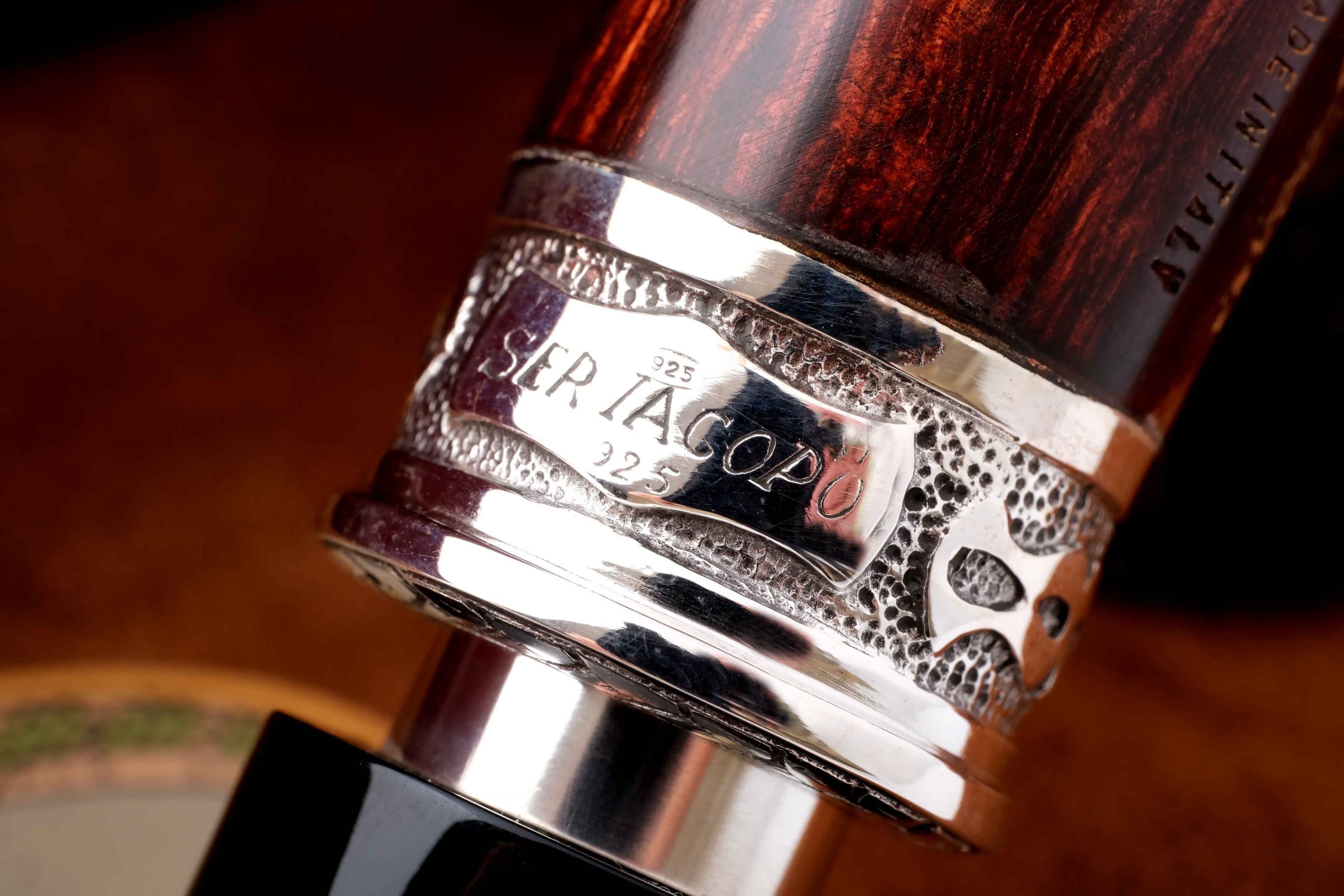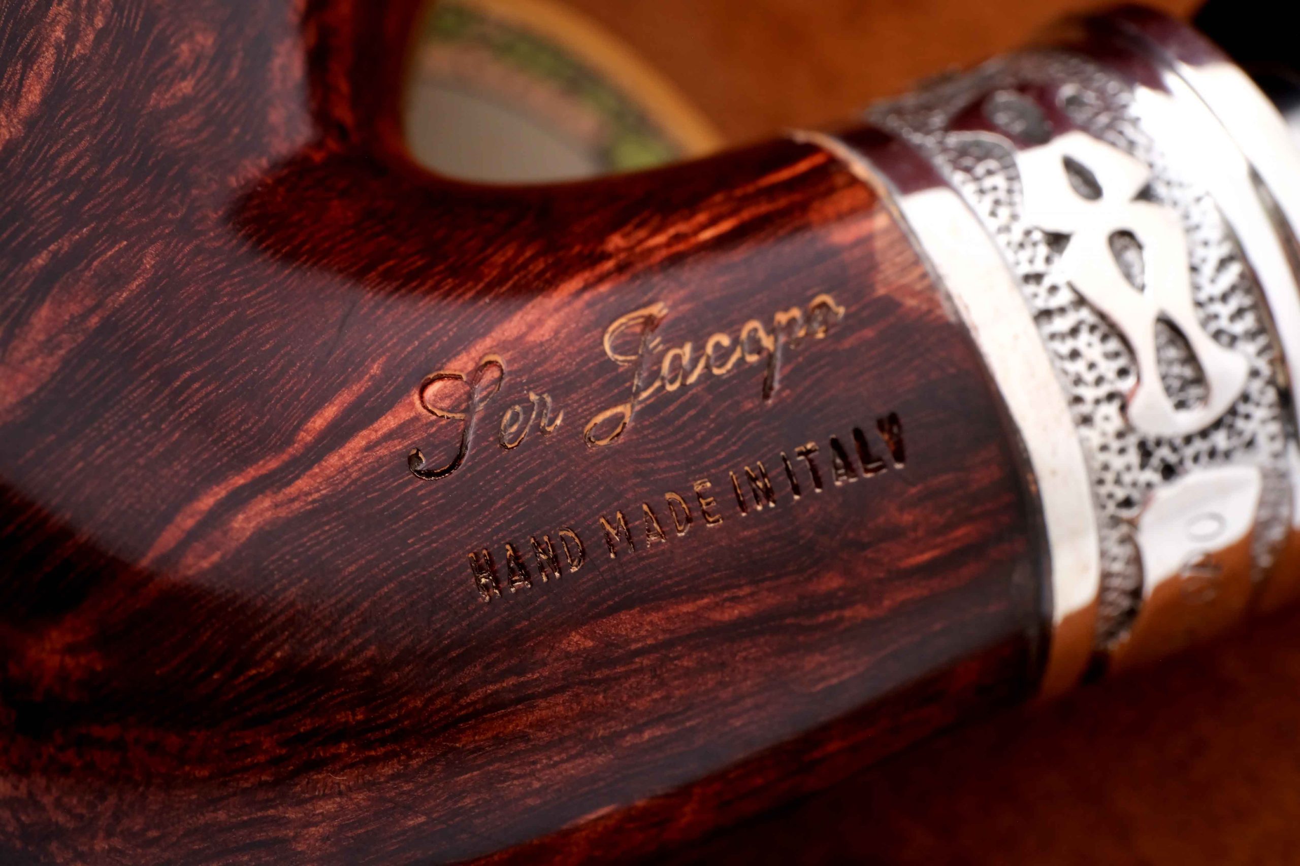 На трубке выбит девиз мастерской Ser Jacopo PER ASPERA AD ASTRA («Через тернии к звездам», лат.), маркировки: Ser Jacopo, Hand made in Italy, грэйд L1 C.